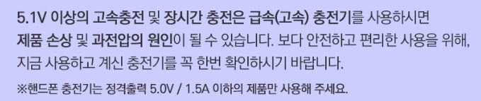 5.1V 이상의 고속충전 및 장시간 충전은 급속(고속) 충전기를 사용하시면 제품 손상 및 과전압의 원인이 될 수 있습니다