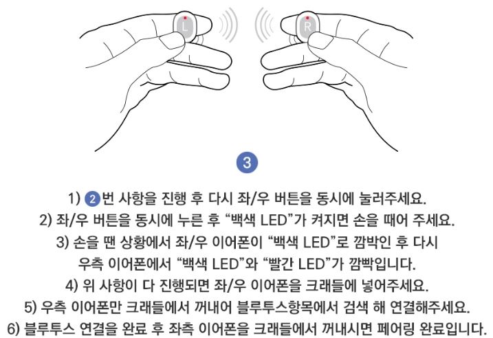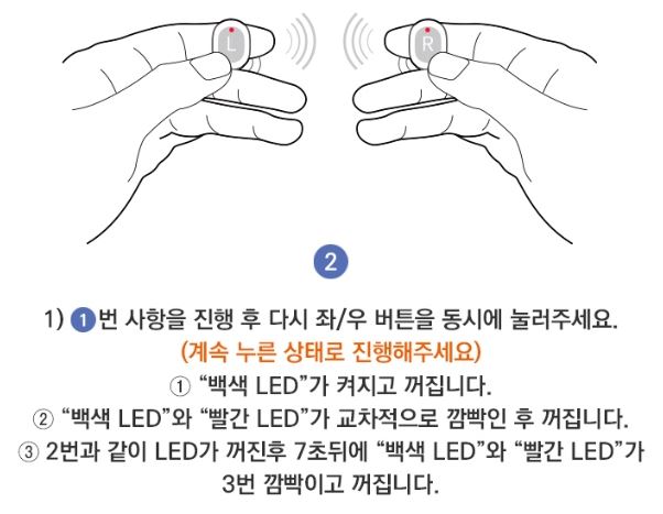 2. 좌/우측 이어폰의 버튼을 빨간 LED가 켜지고 꺼질 때 까지 눌러주세요
