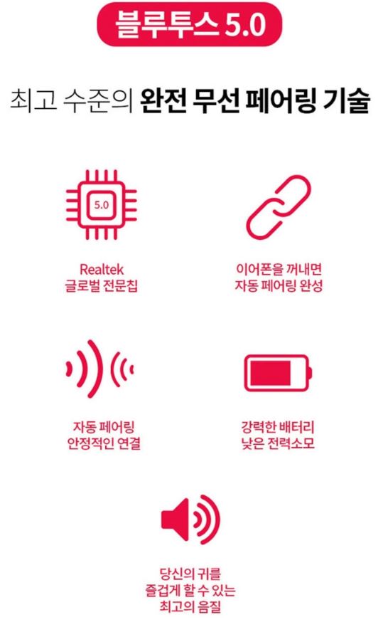 Realtek 글로벌 전문칩, 블루투스 5.0, 이어폰을 꺼내면 자동 페어링, 낮은 전력 소모
