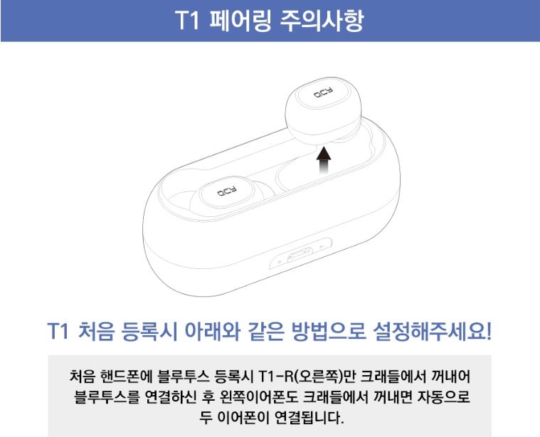 T1 처음 등록시 : 처음 핸드폰에 블루투스 등록시 T1-R(오른쪽)만 크레들에서 꺼내어 블루투스를 연결 하신 후 왼쪽 이어폰도 크래들에서 꺼내면 자동으로 두 이어폰이 연결됩니다