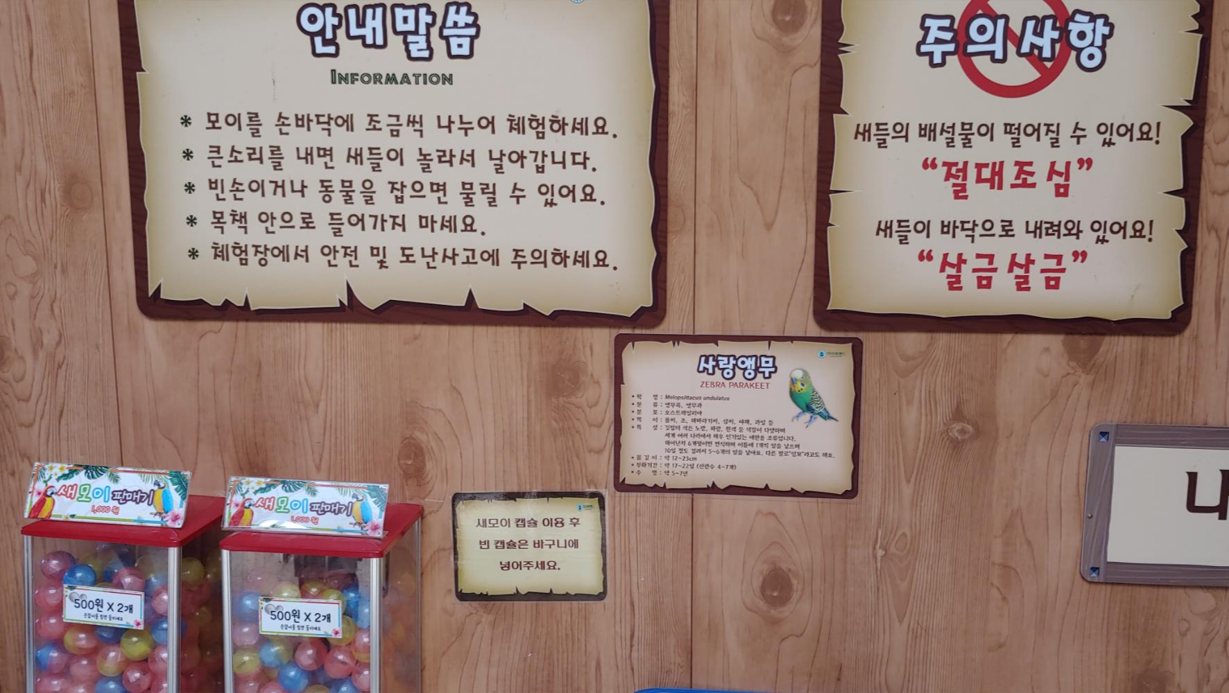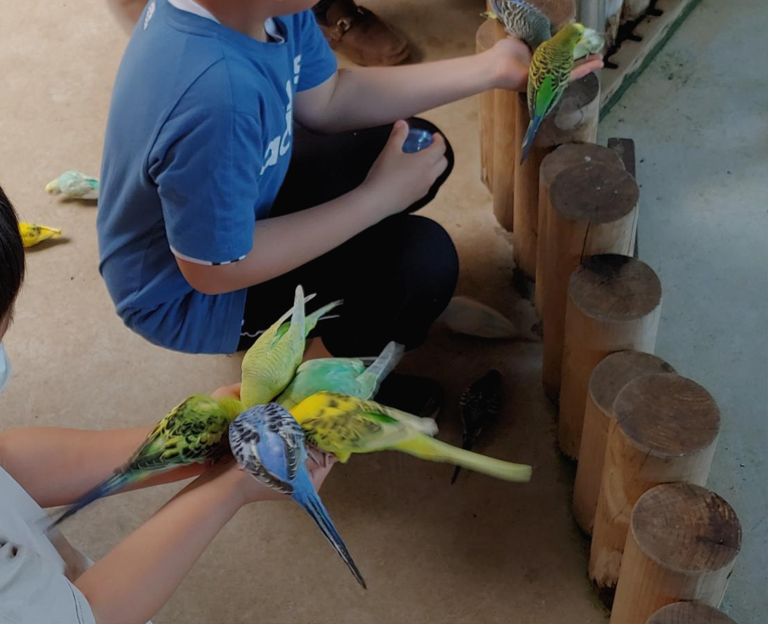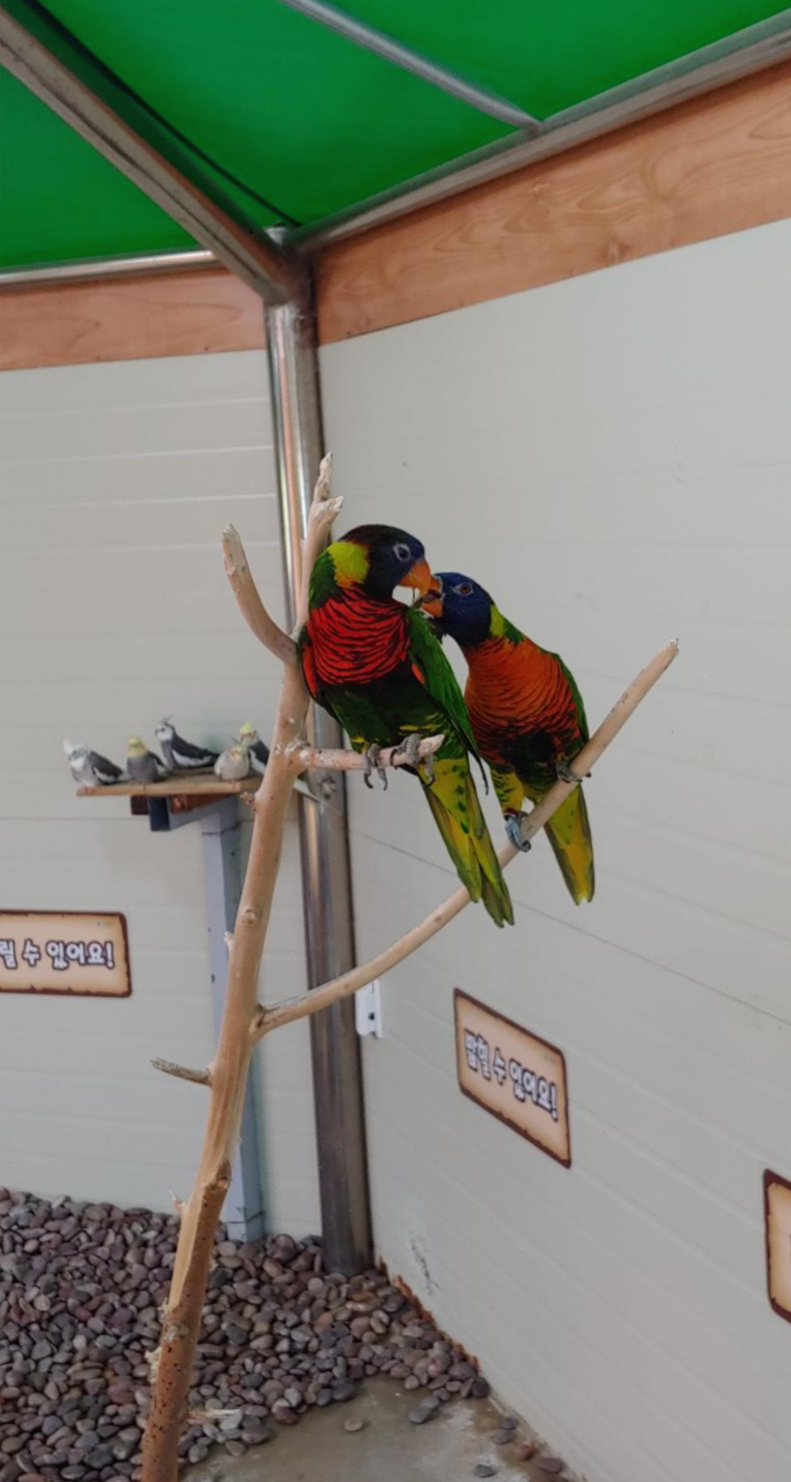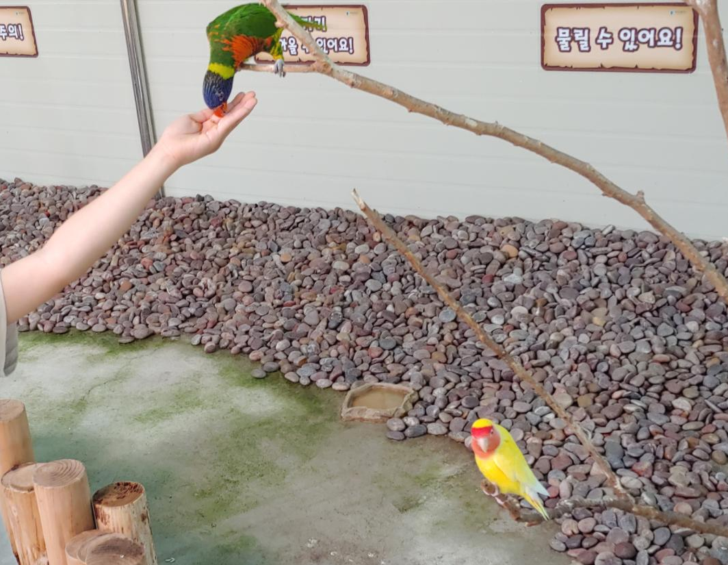 새들이 있는 건물에 들어가면 먹이를 손에 올려두면 새들이 날아와 먹이를 먹어서 아이들이 체험하기 좋습니다