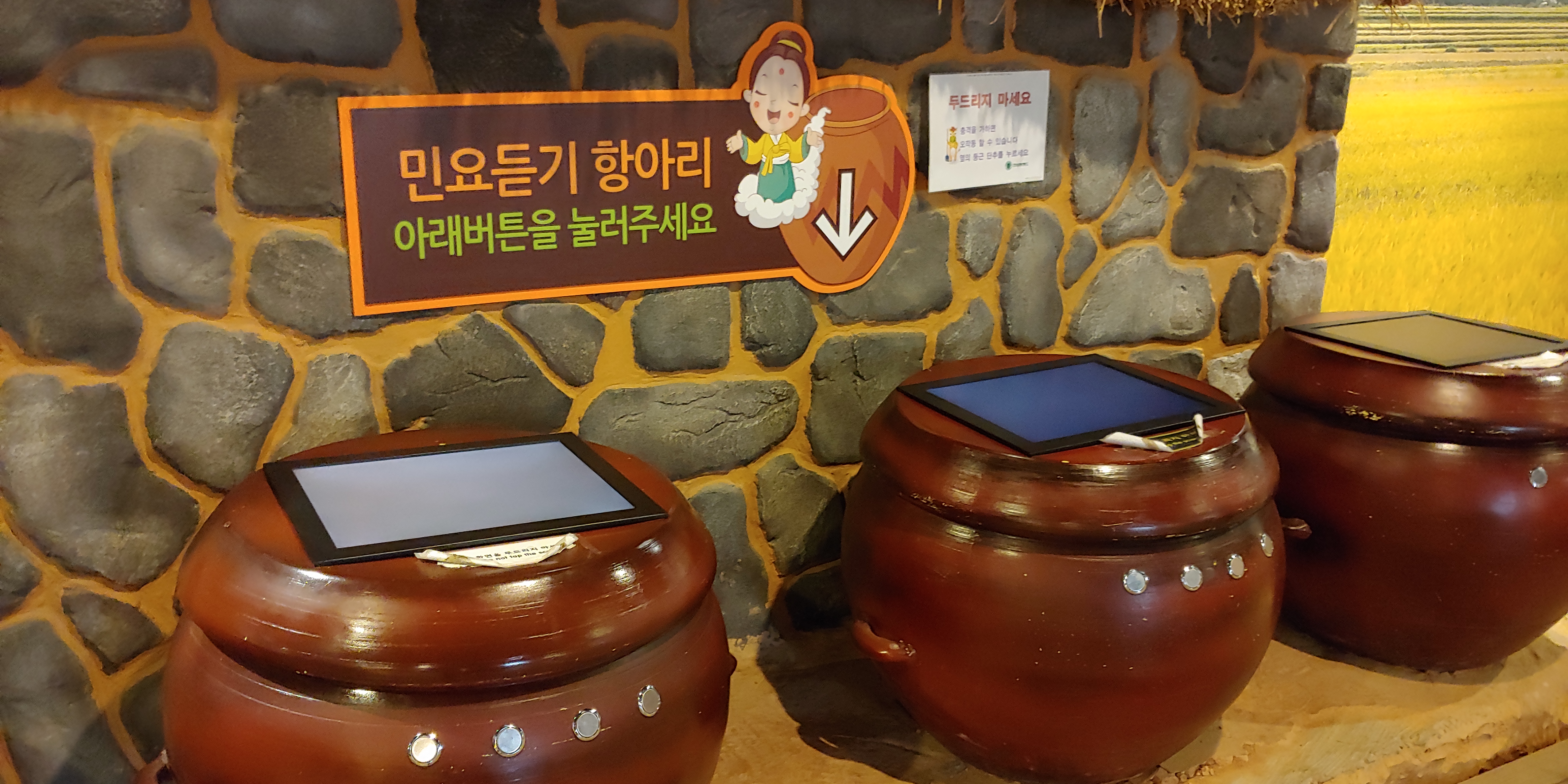 예전에 사용했던 물건들과 민요를 들을 수 있는 항아리 화장실 수유실이 있었습니다