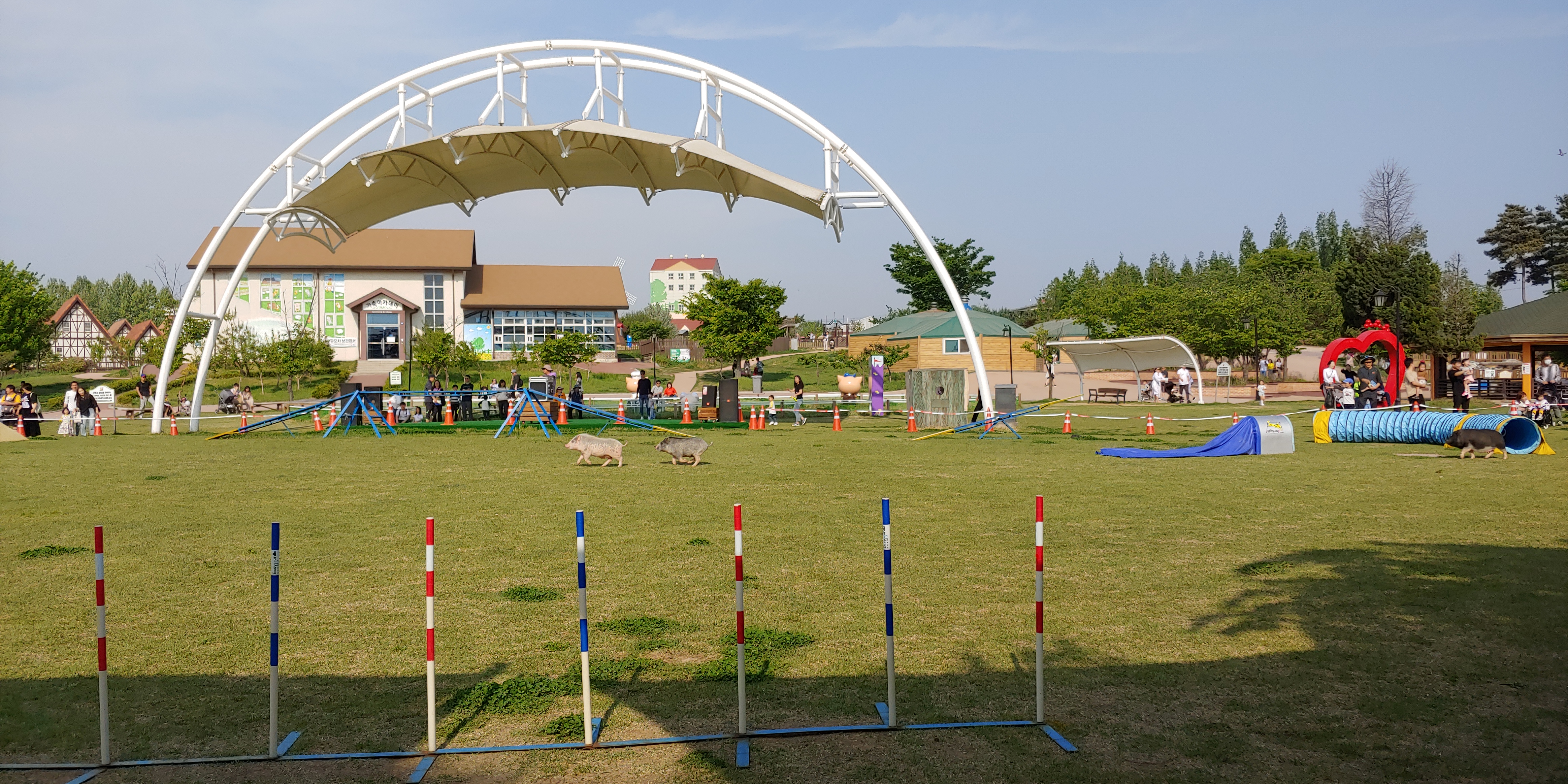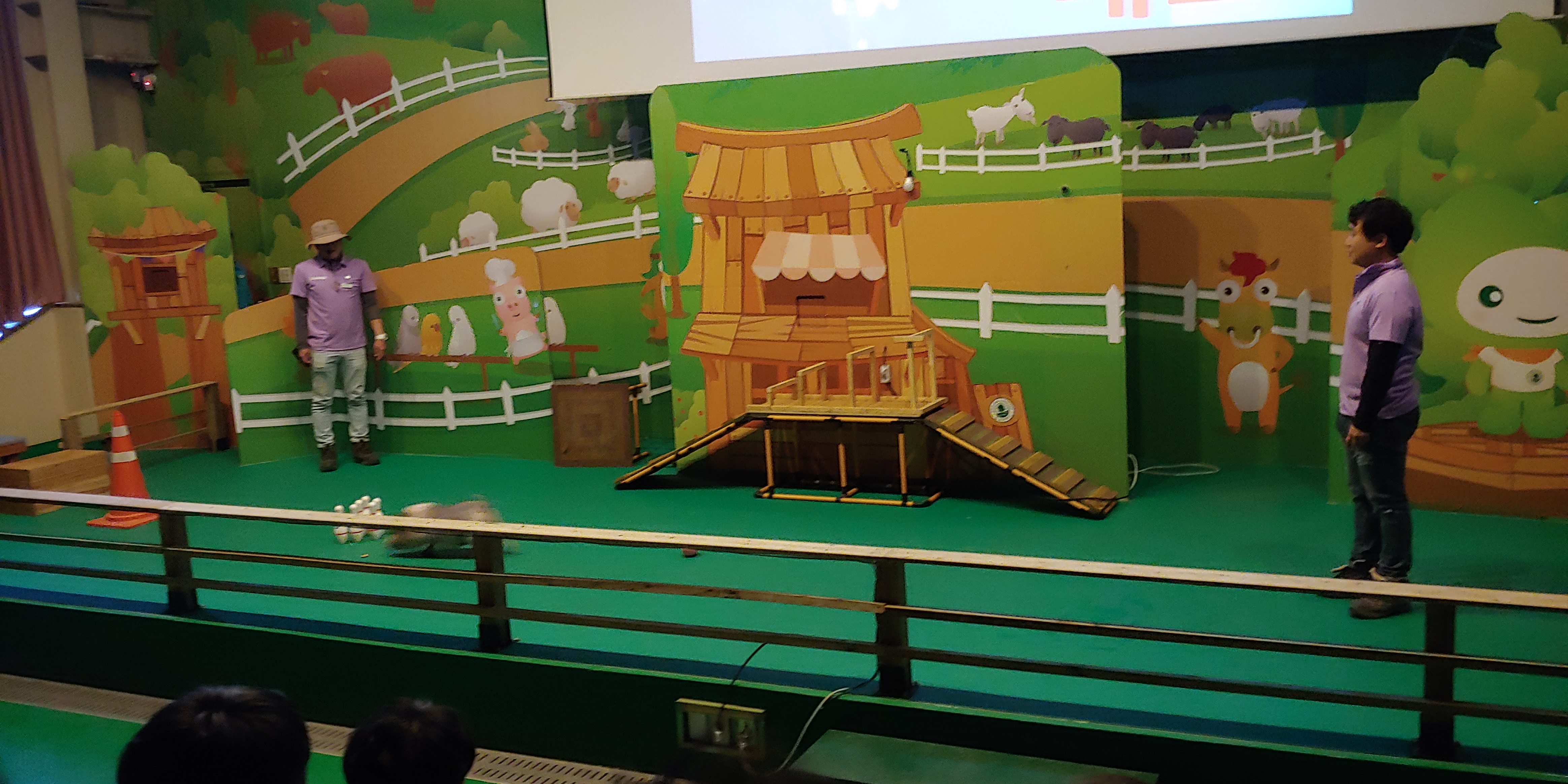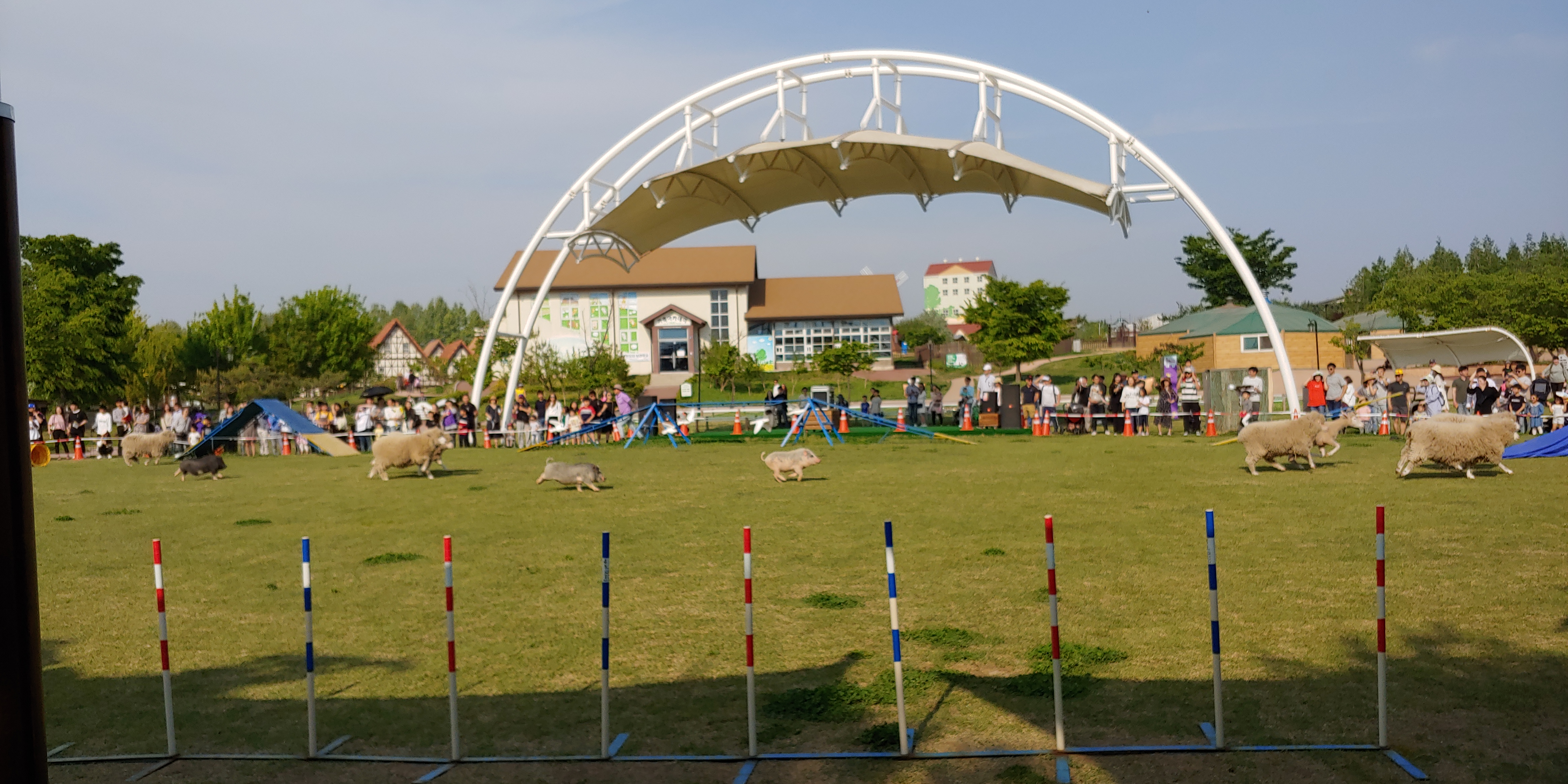 안성 팜 랜드 폐장 시간이 다되어 주요 동물들이 공연을 하였고 원반을 던지면 물어오고 장애물을 통과하는 개의 공연이 메인 인듯 했습니다