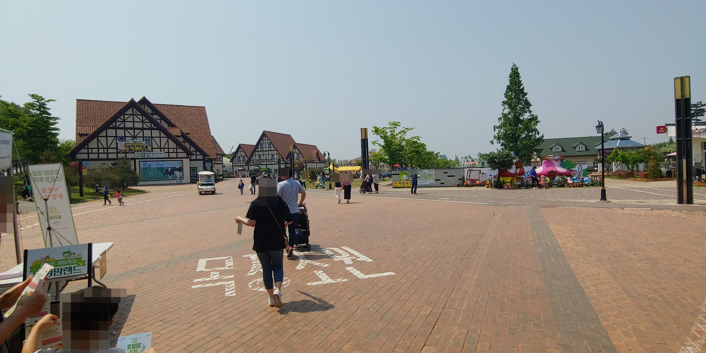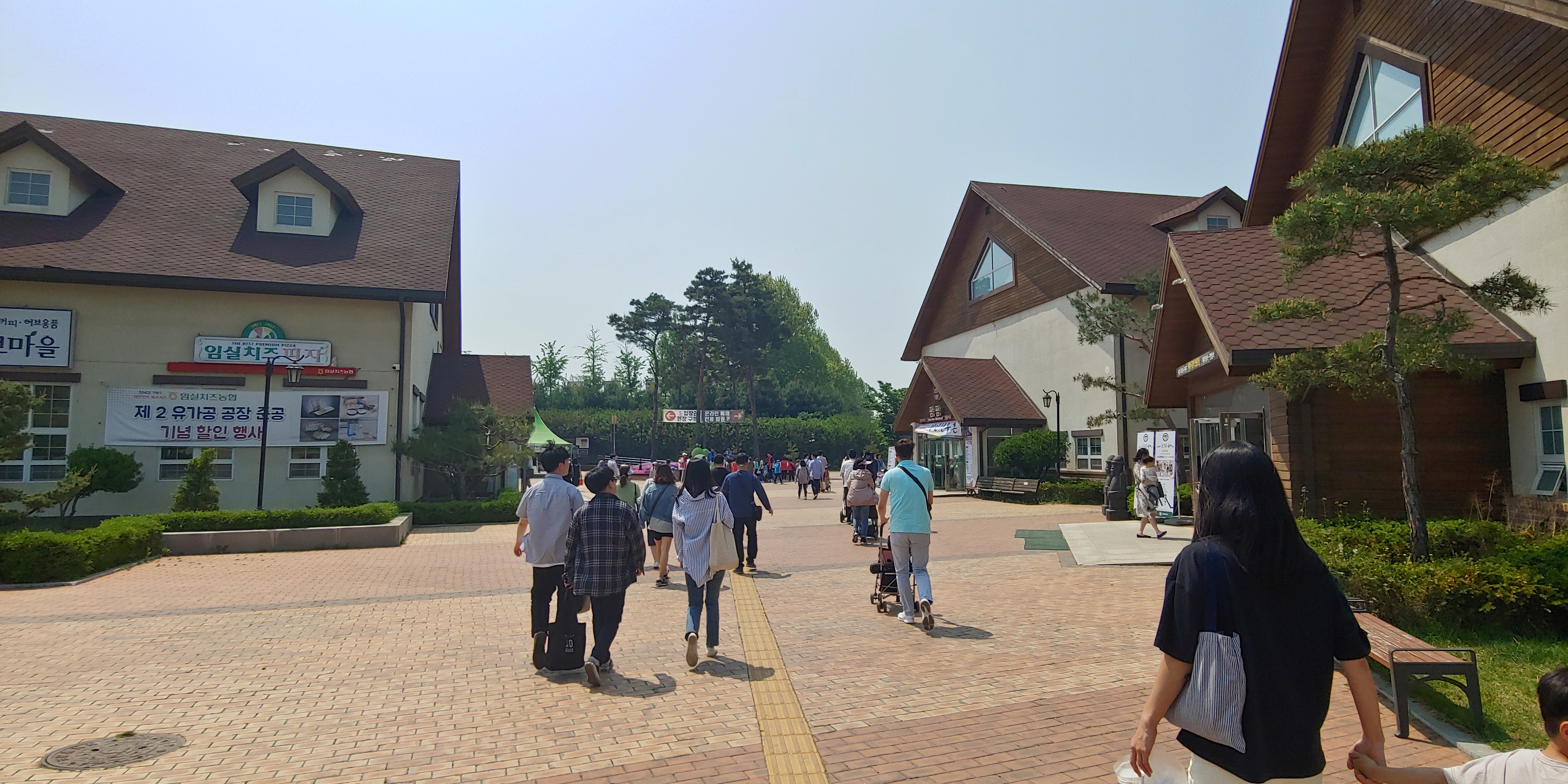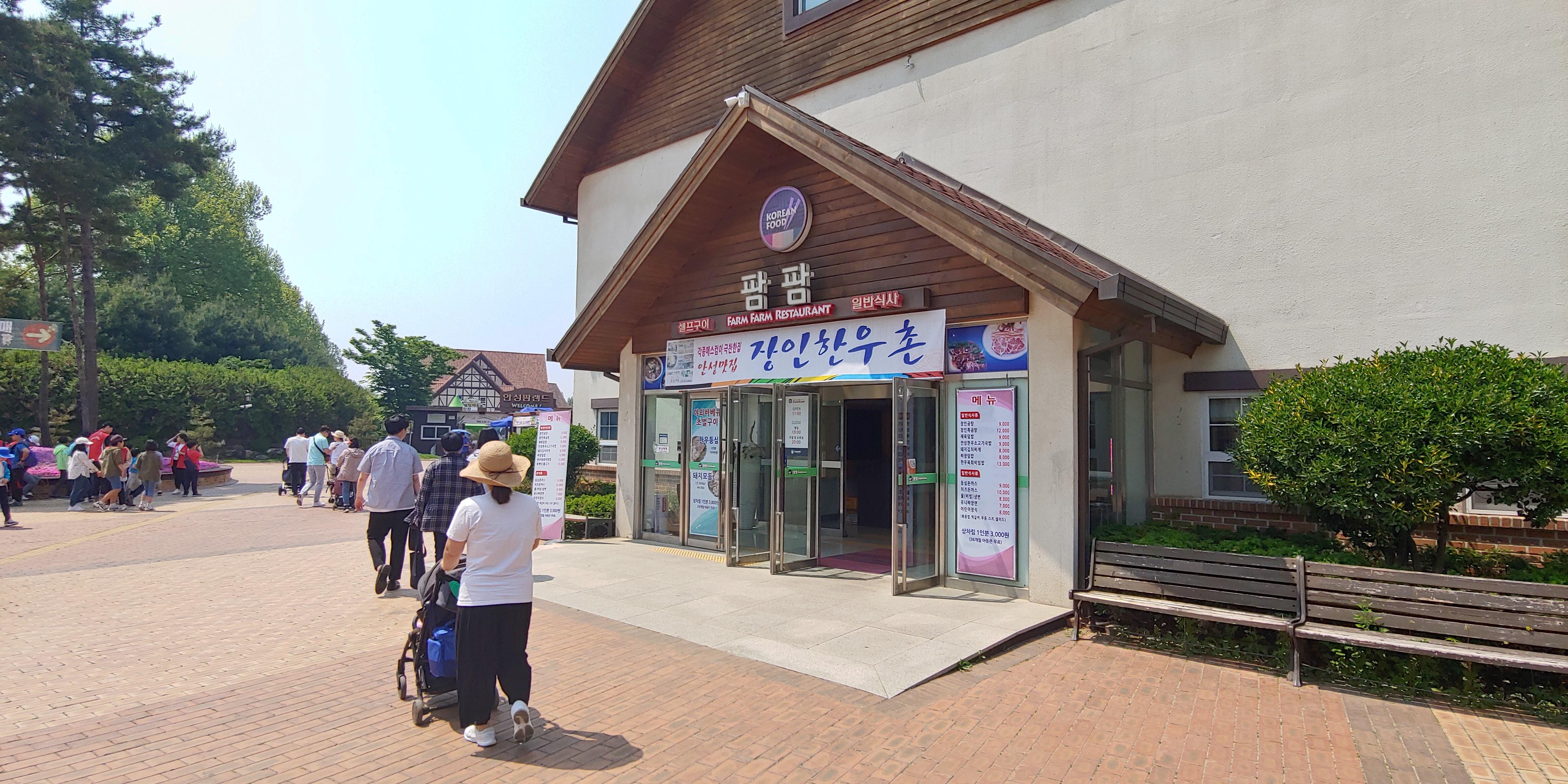 안성 팜랜드 주차장에서 매표소로 걸어가는 길에 식당 및 편의점이 있습니다