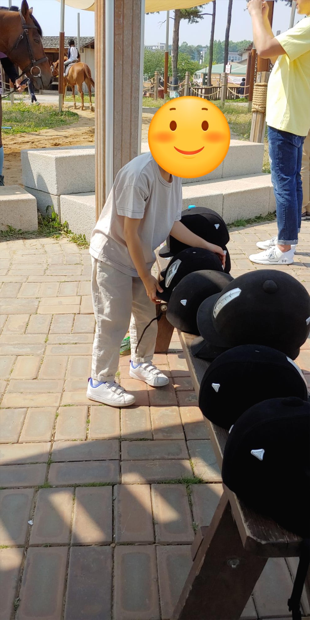 대기 줄을 서고 있다가 표를 확인하고 돌아오는 말에 타기전 앞에 놓여있는 헬멧을 착용하고 기다리면 됩니다
