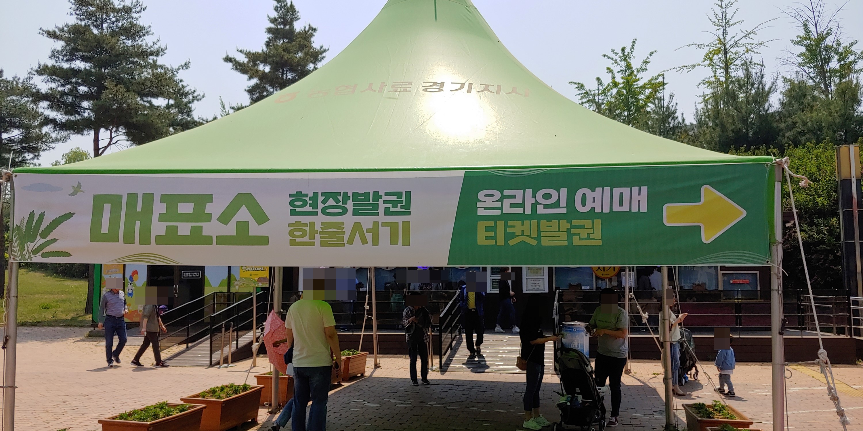 식당과 편의점이 있는 길을 지나면 정면에 보이는 나무를 기준으로 왼쪽은 현장 구매 하는 곳이고 오른쪽은 온라인 예매 티켓을 받는 곳 입니다
