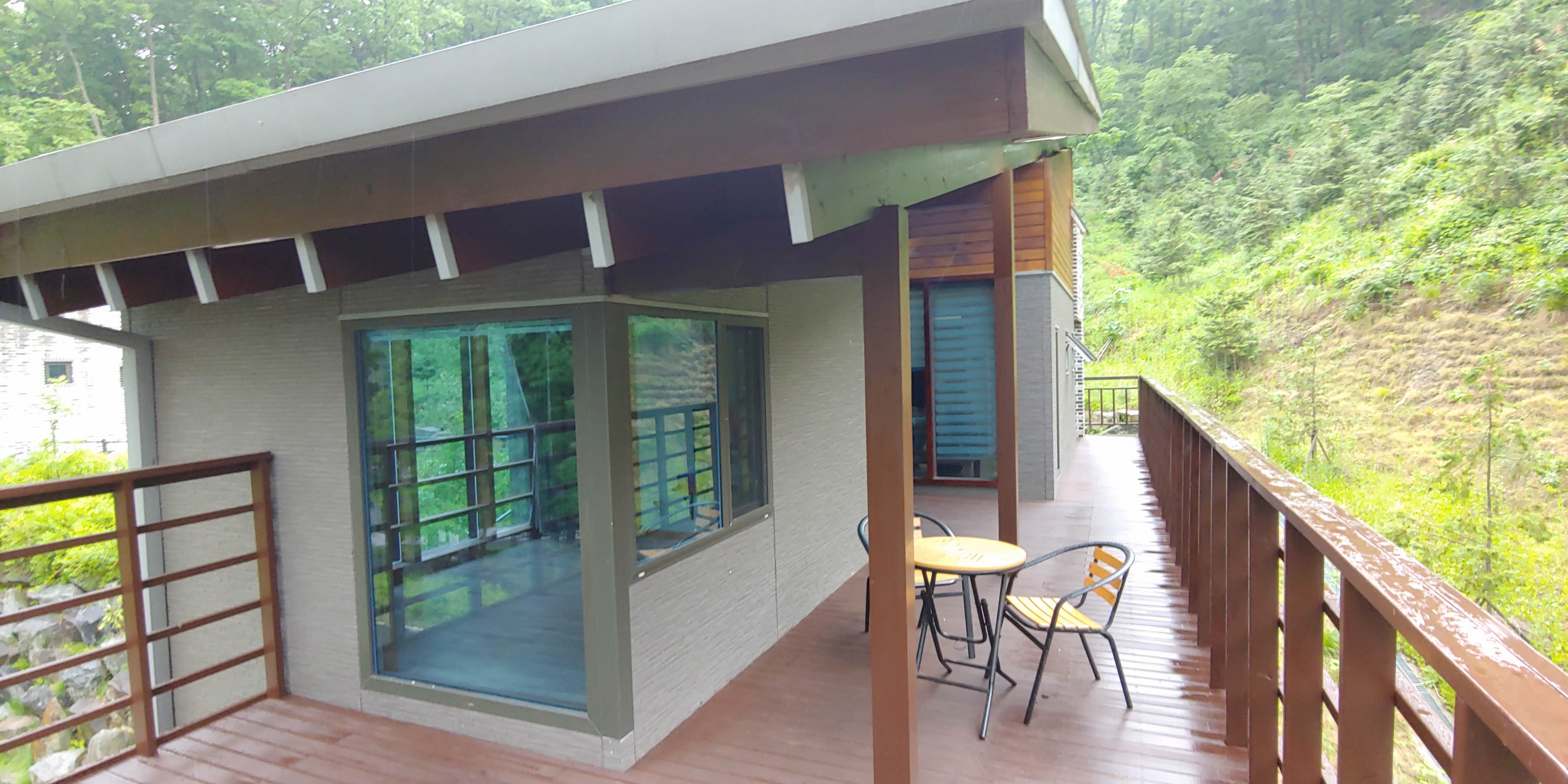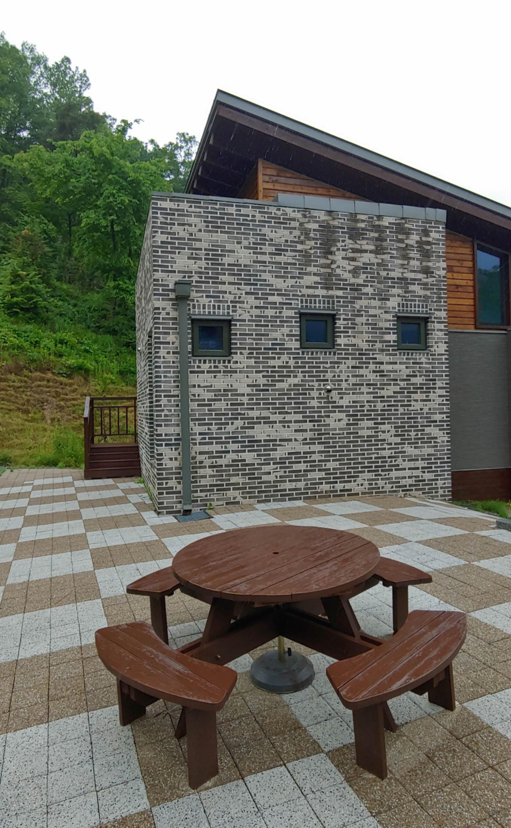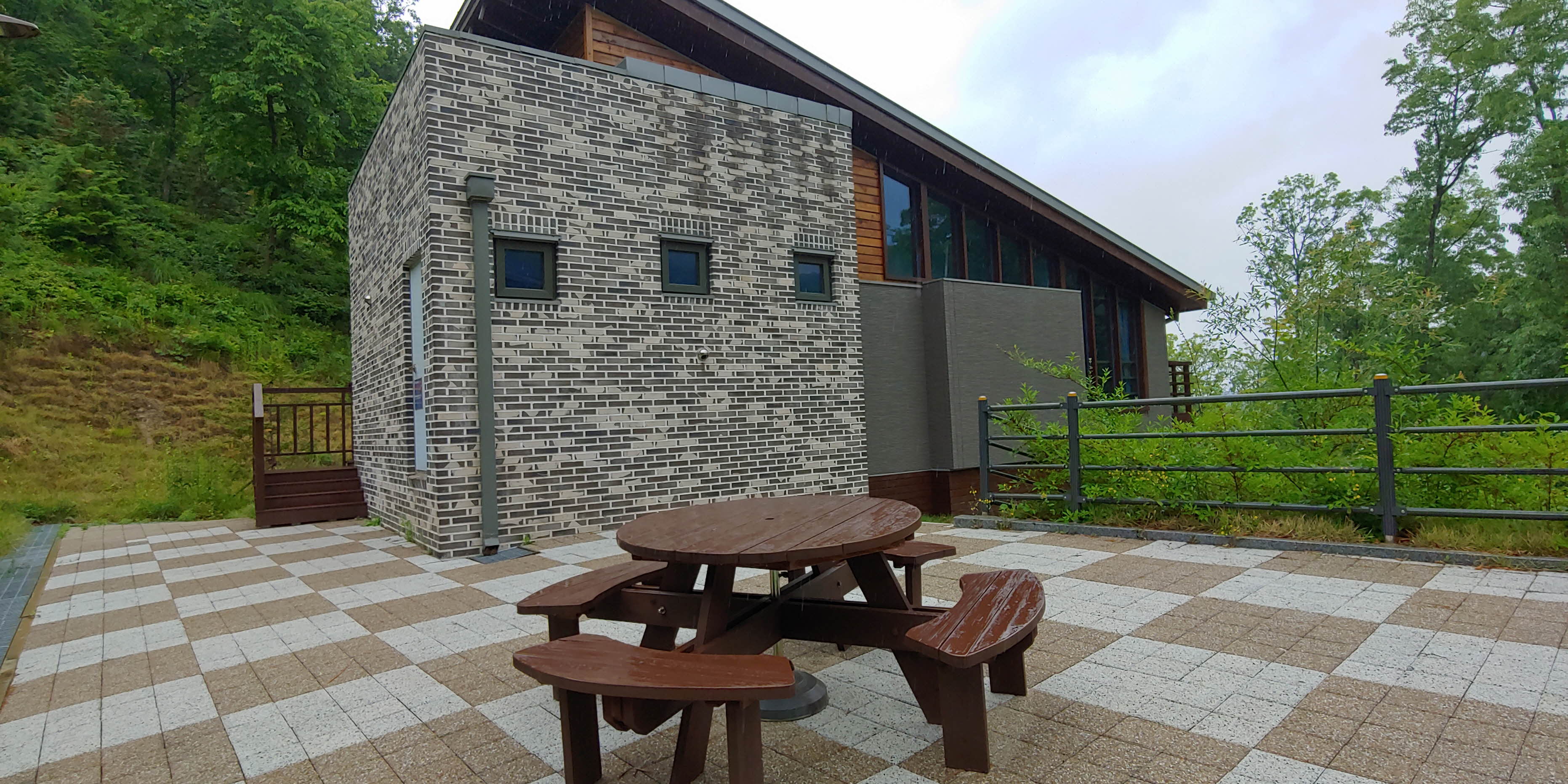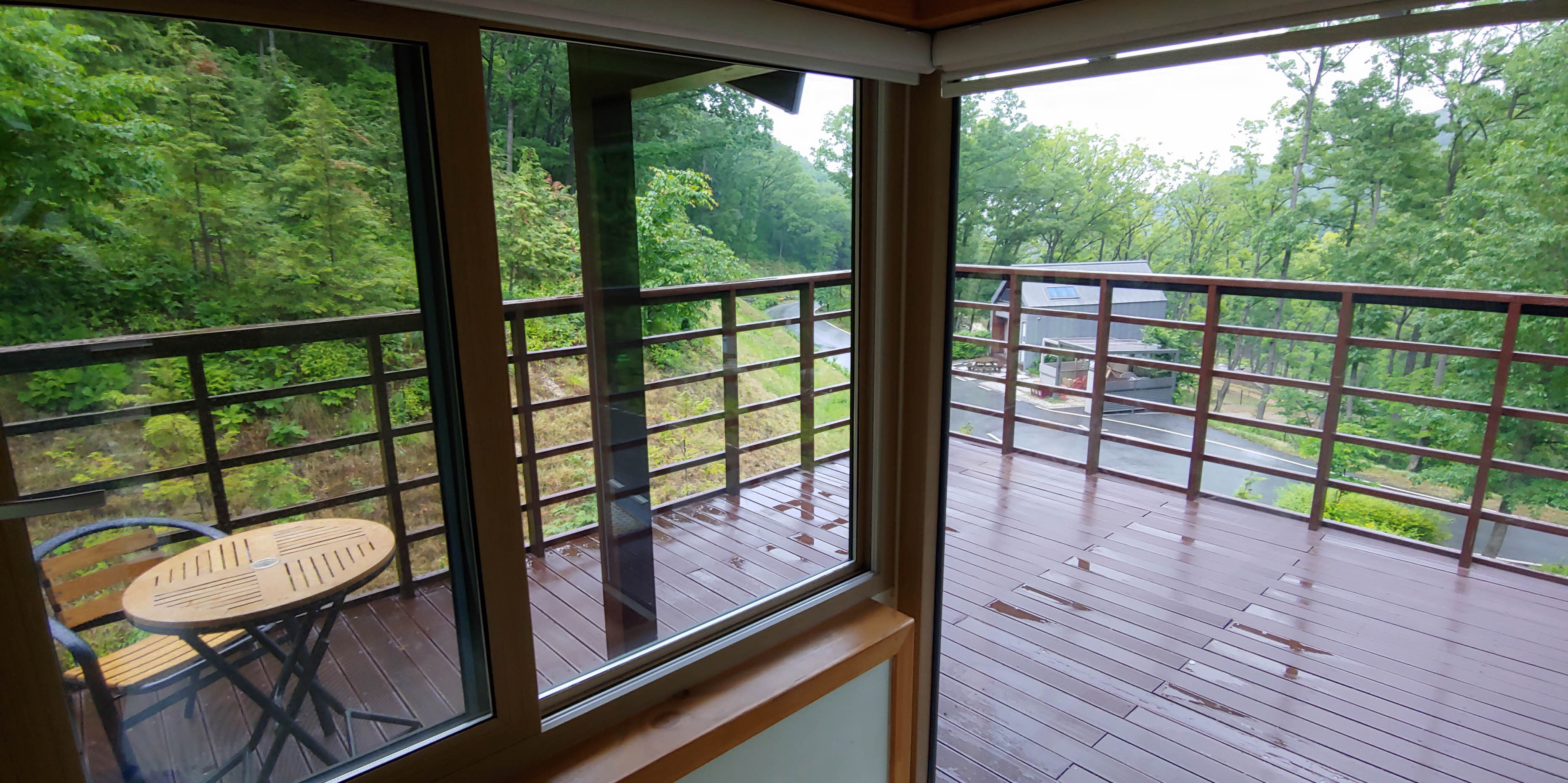 10인실 출입구 반대편에는 테이블과 의자가 있는 테라스가 있고 위에서 보면 6인실 숲속의 집과 쓰레기 분리수거장이 보였습니다
