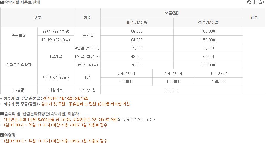 산림문화휴양관 : 4인실(21.5㎡), 2실, 5인실(30.4㎡), 2실, 8인실(43㎡), 2실, 세미나실