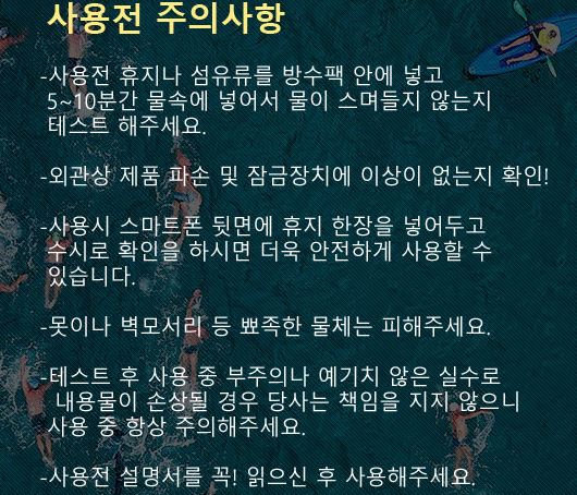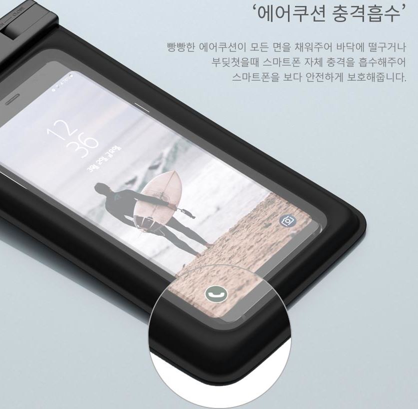해변, 풀장, 계곡, 물놀이 외 레저스포츠 활동을 할 때 스마트폰을 물로부터 완벽하게 차단 보호 해줍니다