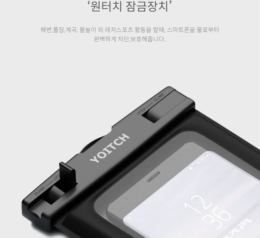 잠금장치는 스마트폰을 넣고 뺄때 편했으며 처음에는 기존 사용해봤던 방수팩보다 좀 불안해 보였으나 테스트시 방수가 잘되었습니다