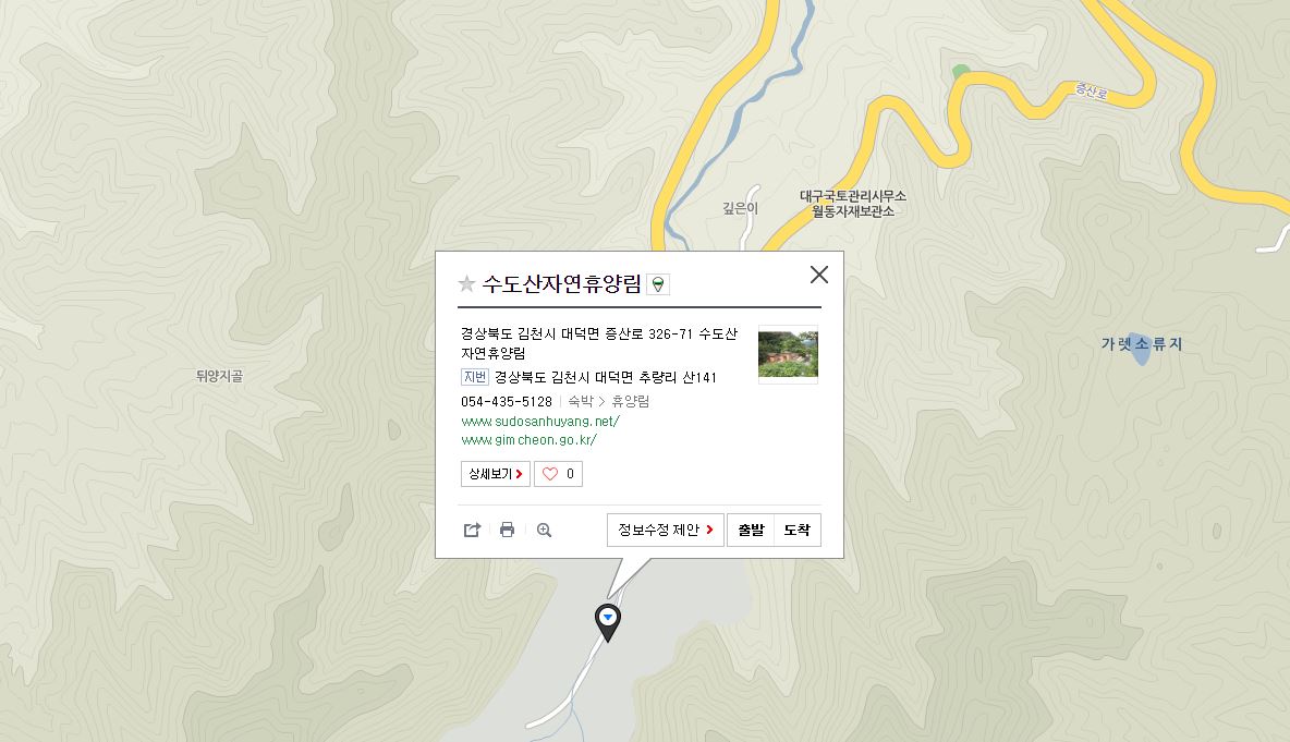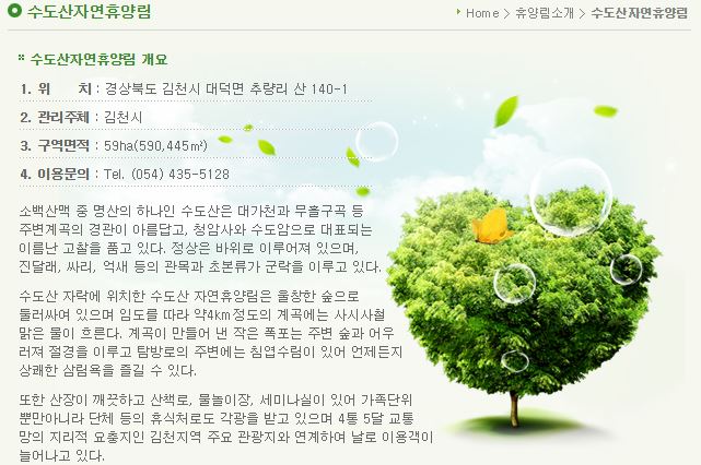 기타사항은 수도산 자연휴양림 관리사무소(054-435-5128)로 문의바랍니다