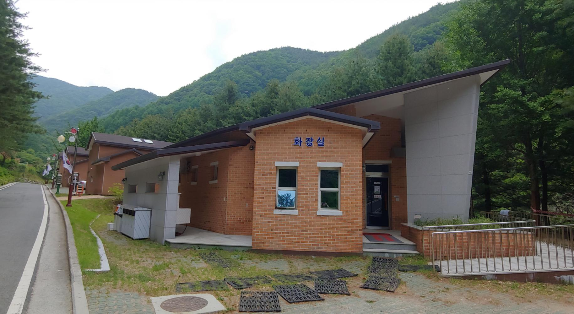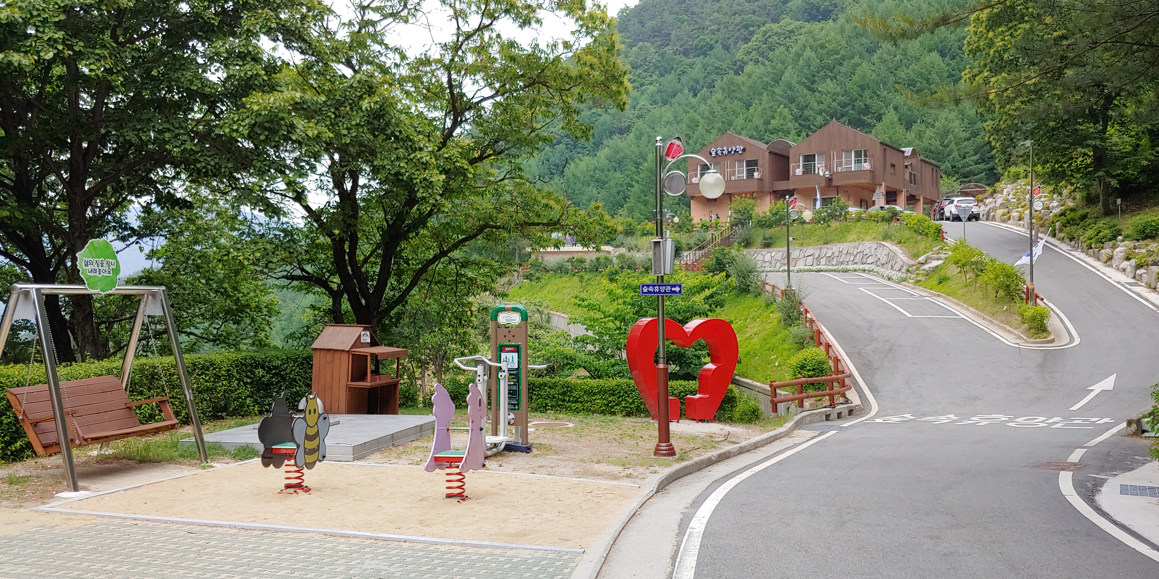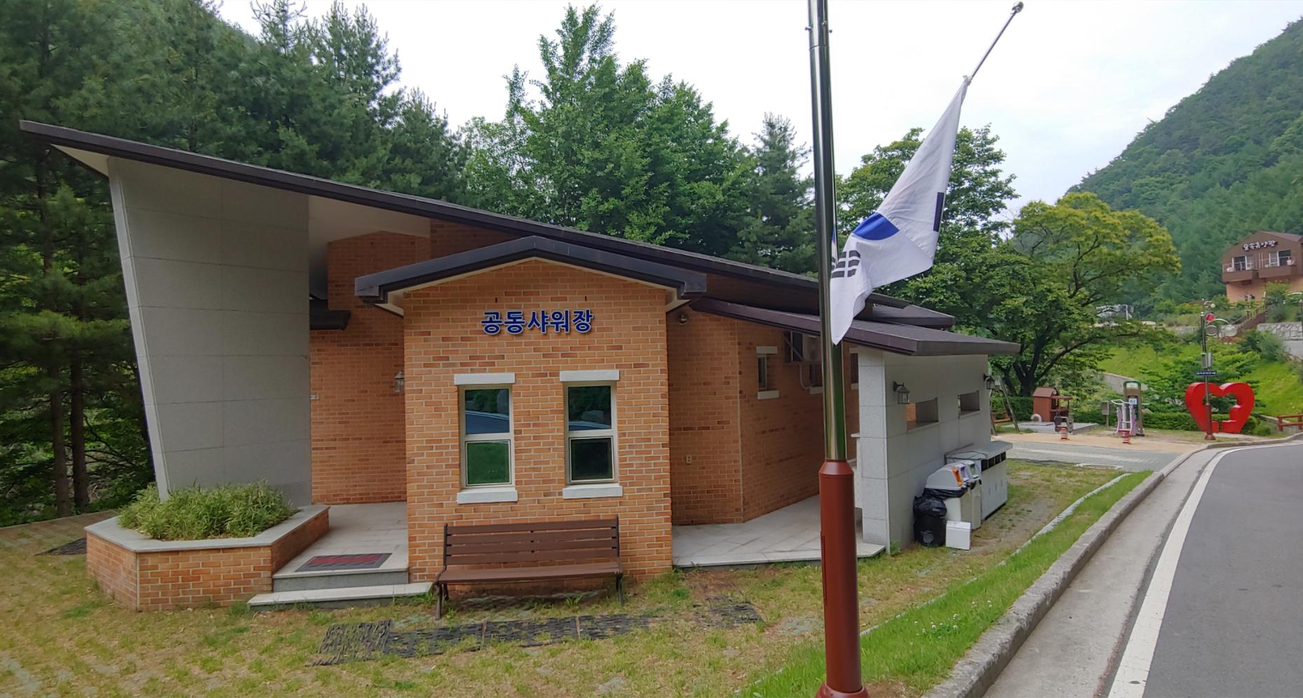 공동 샤워장과 화장실과 작은 놀이터 사이에 물놀이장으로 갈 수 있는 계단이 있고 놀이터 지나 보이는 곳은 숲속휴양관이였습니다