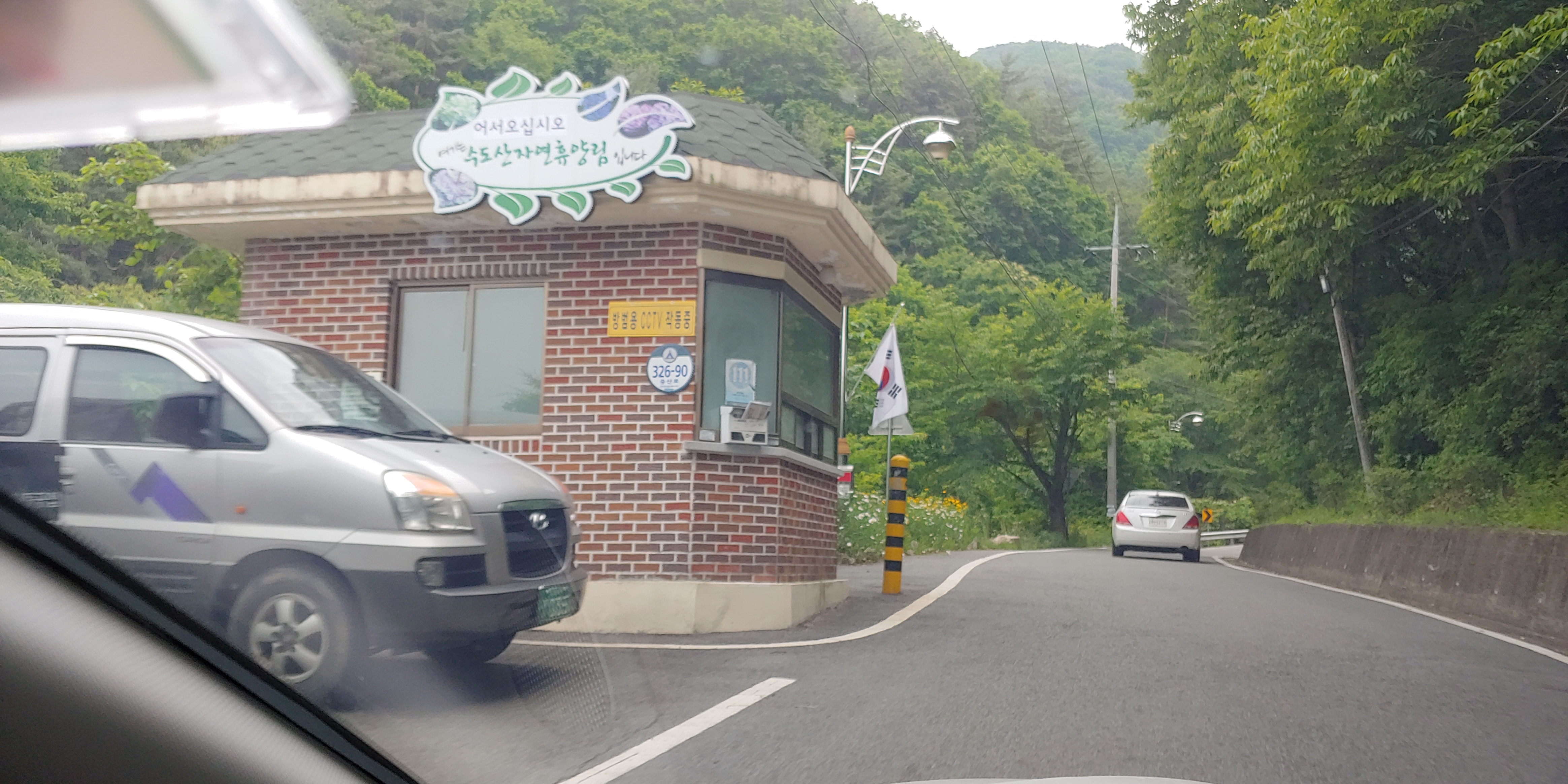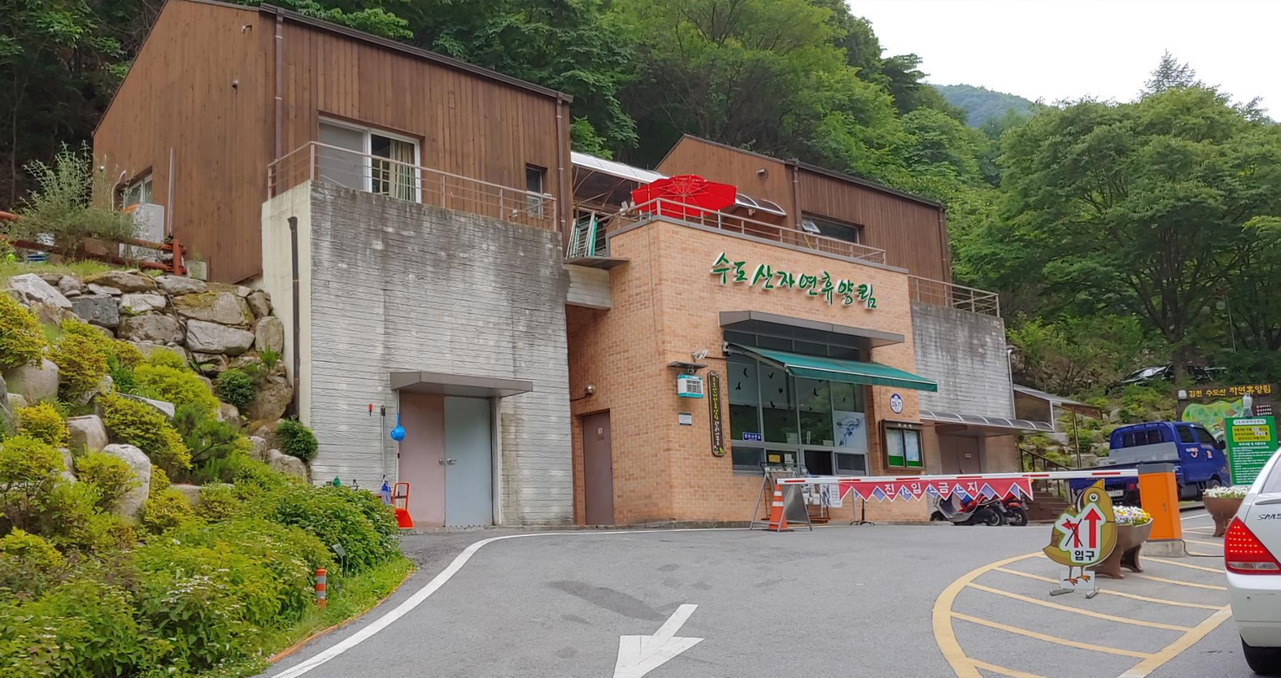 김천 수도산 자연휴양림을 여행하기 위해 산길을 차량으로 이동하면 수도산 자연휴양림이라는 작은 초소 같은게 보입니다