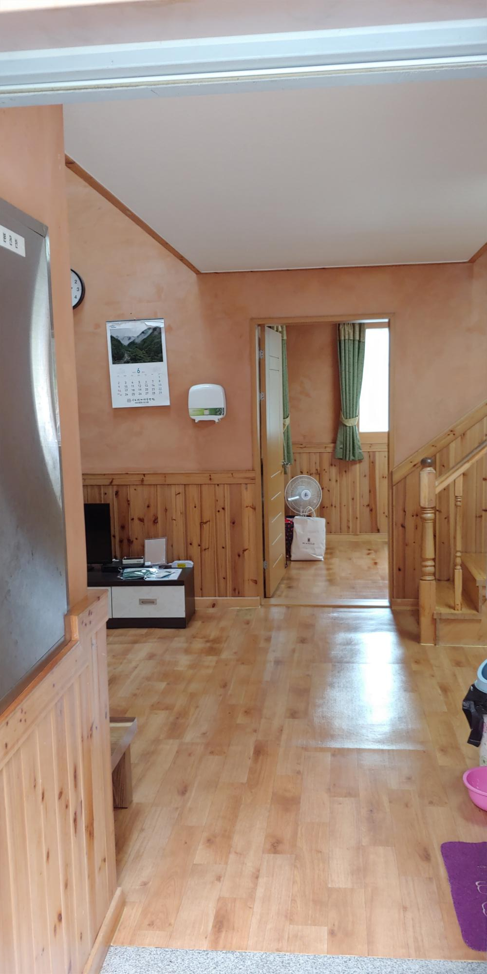 숲속의집 현관을 들어 가면 신발장과 화장실이 오른쪽에 있었고 복층으로 올라가는 계단 가기전에 주방이 있었습니다