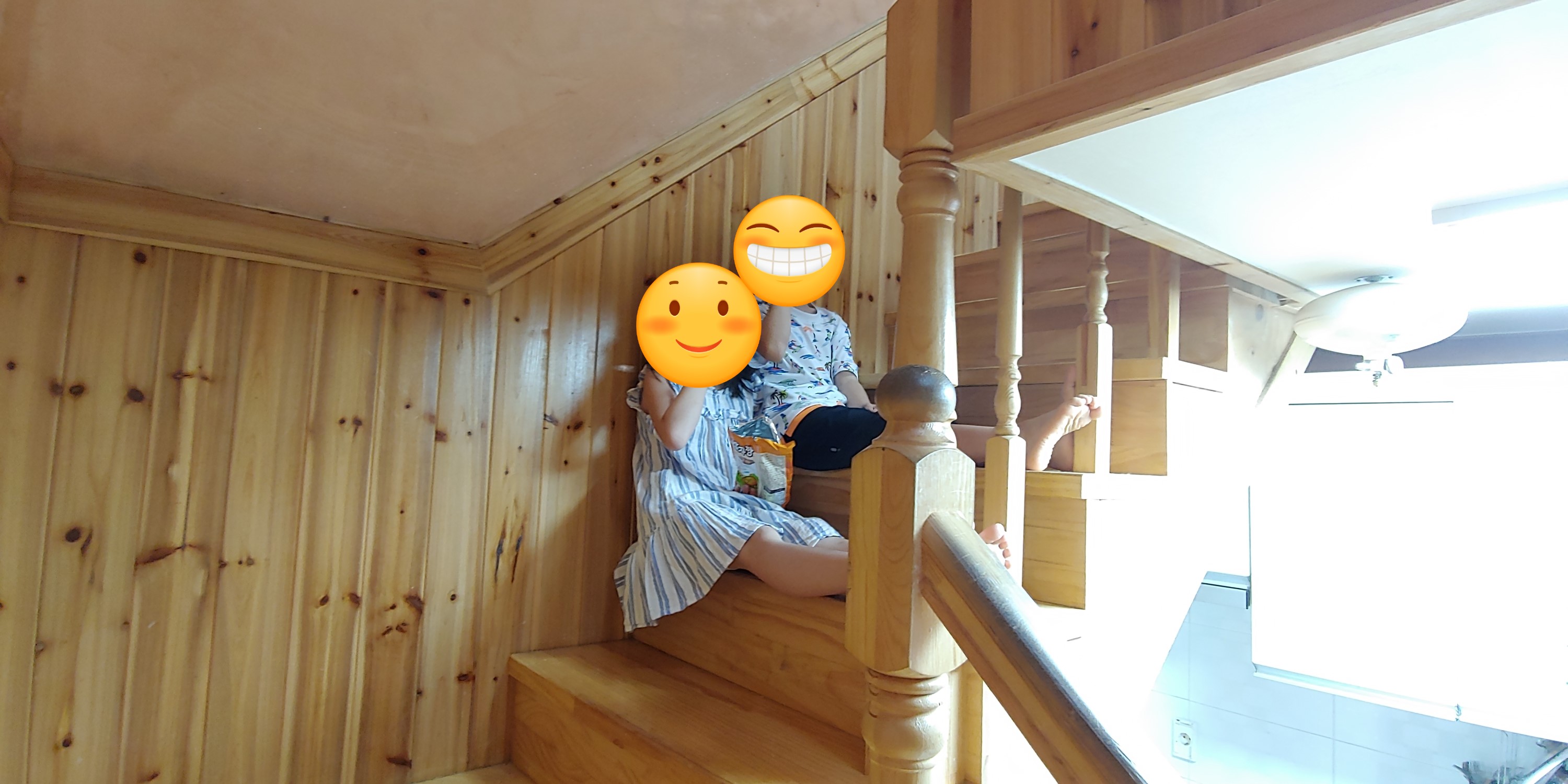 복층으로 올라가 보니 생각보다 넓어서 아이들이 놀기 좋았으나 계단이 조금 높아 아이들에게는 조금 위험해 보였습니다