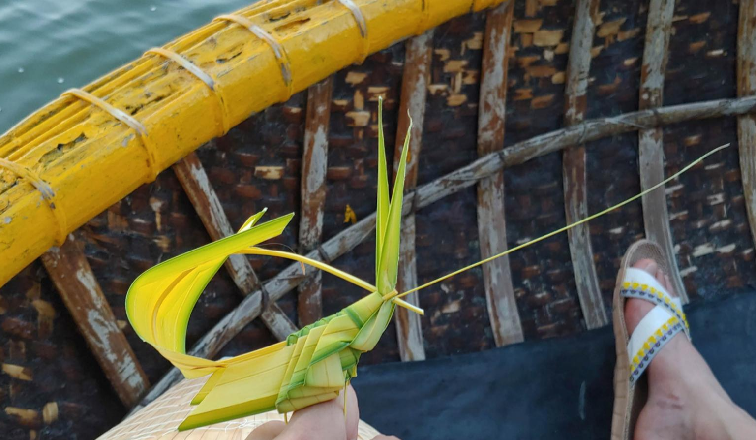 바구니배 노를 저으시는 분이 어느정도 노를 저으시다가 미리 만들어둔 메뚜기 반지와 꽃 반지 등을 손에 끼워 주셨고 왕관과 물고기등을 직접 만들어서 주셨습니다