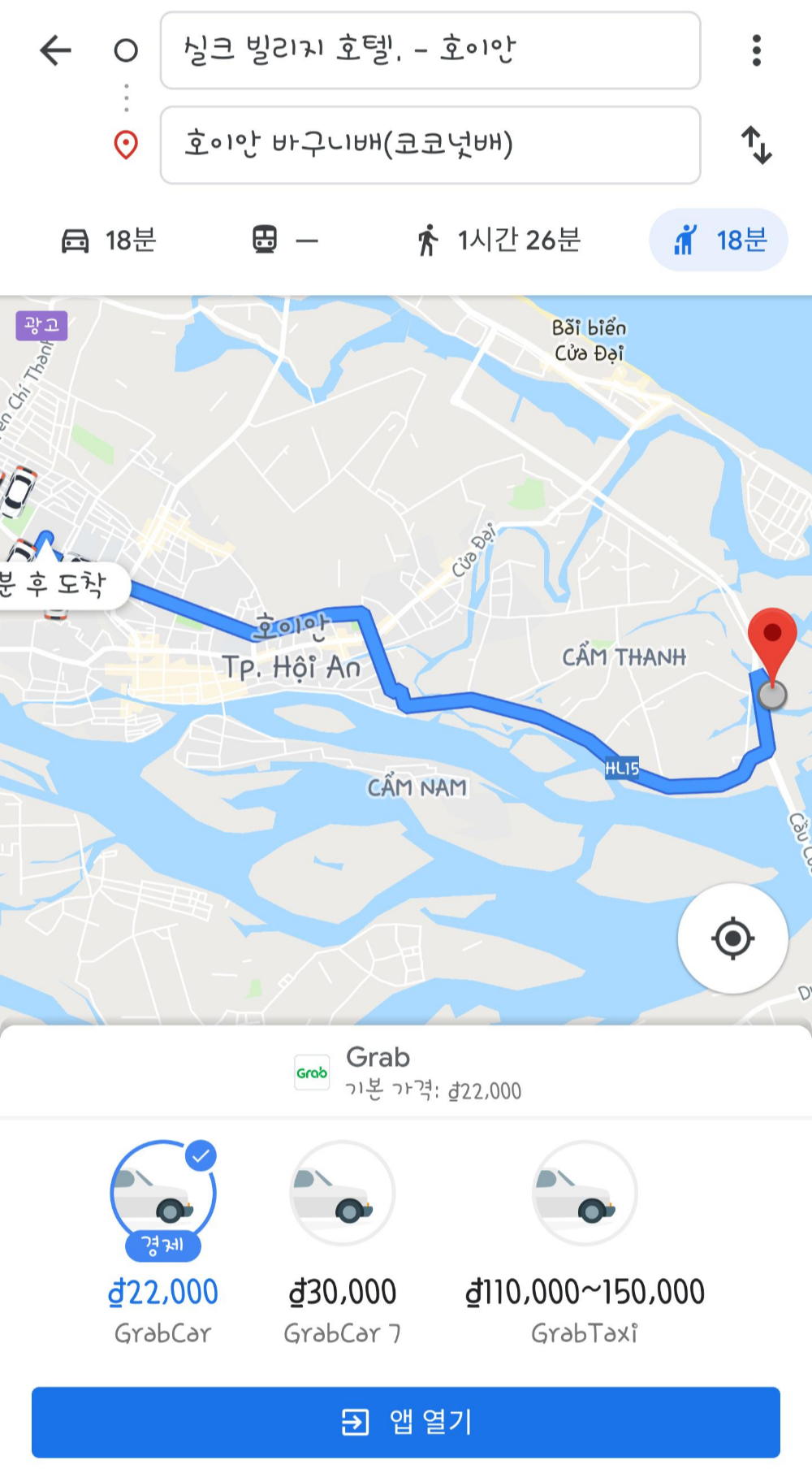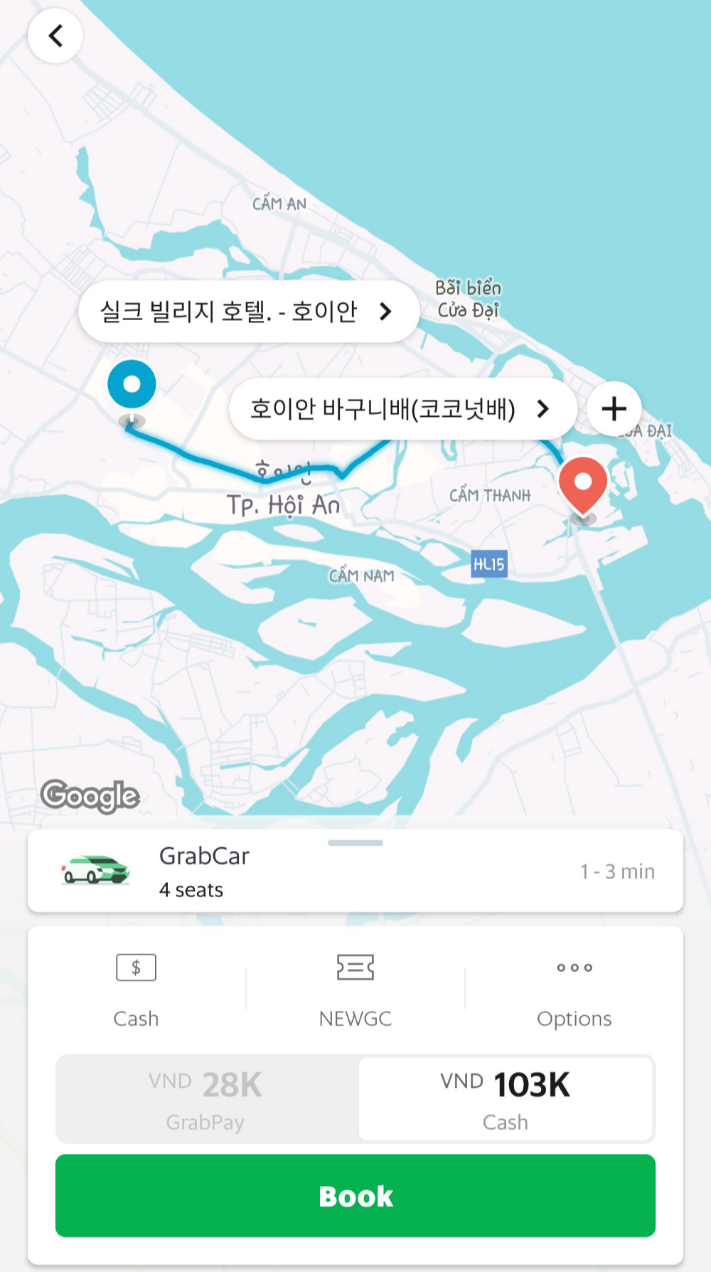 차량으로 이동 비용은 유료 였으며 검색 해본 그랩 비용과 비슷한 10만동(약 5,000원) 이었습니다