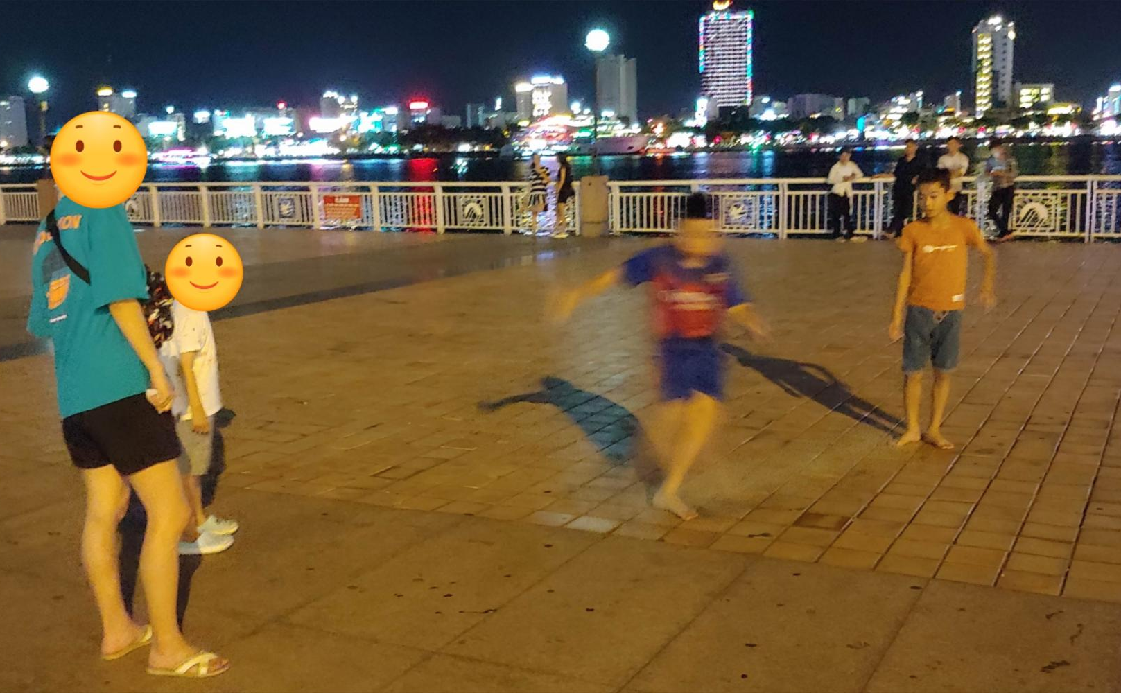 춤 연습을 하는 사람들을 보고 있는데 뒷쪽에 맨발로 축구 하는 아이들이 있었습니다