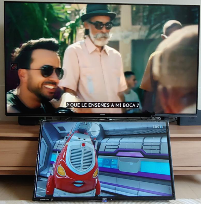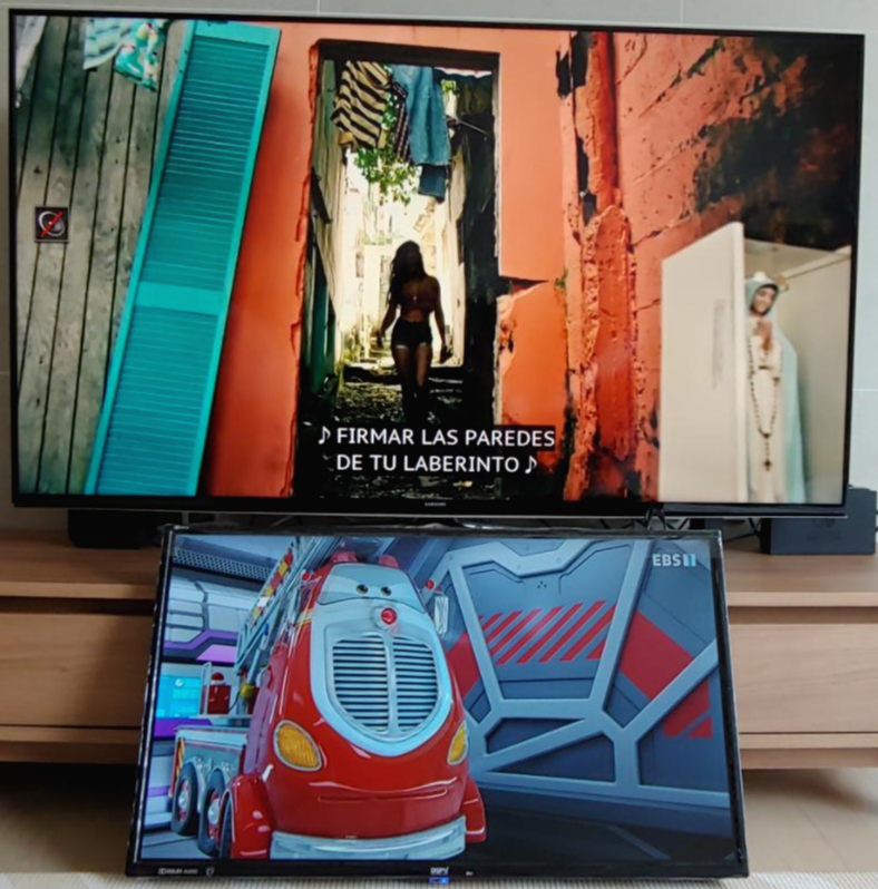 비교 하기전에는 작다고 생각하지 않았는데 인치의 차이는 꽤 실감이 갔지만 화질은 크게 차이 나는게 없는 듯 했습니다