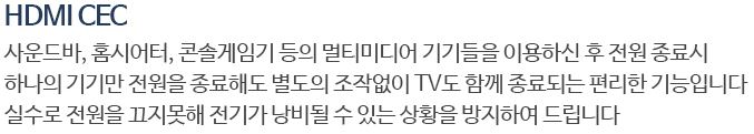 사운드바, 홈시어터, 콘솔게임기 등의 멀티미디어 기기들을 이용하신 후 전원 종료시 하나의 기기만 전원을 종료해도 별도의 조작없이 TV도 함께 종료되는 편리한 기능입니다