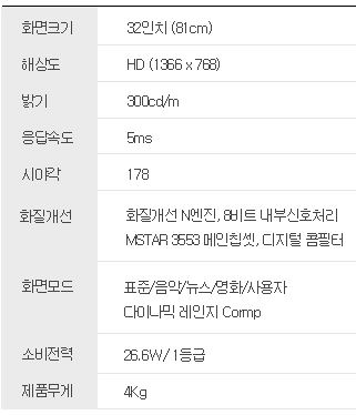화면사양 : 81cm, 1366*768HD해상도, 16:9비율