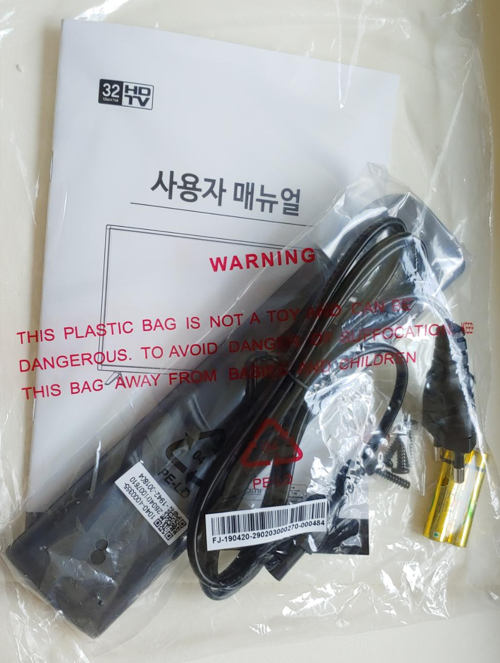 그리고 사용설명서, 리모컨, 스탠드 및 조립나사, AAA 건전지 2개가 들어있는 비닐을 꺼냈습니다