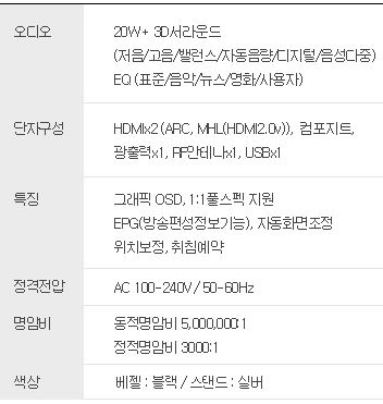 오디오 : 20W + 3D 서라운드(저음, 고음, 밸런스, 자동음량, 디지털, 음성다중), EQ(표준, 음악, 뉴스, 영화, 사용자)
