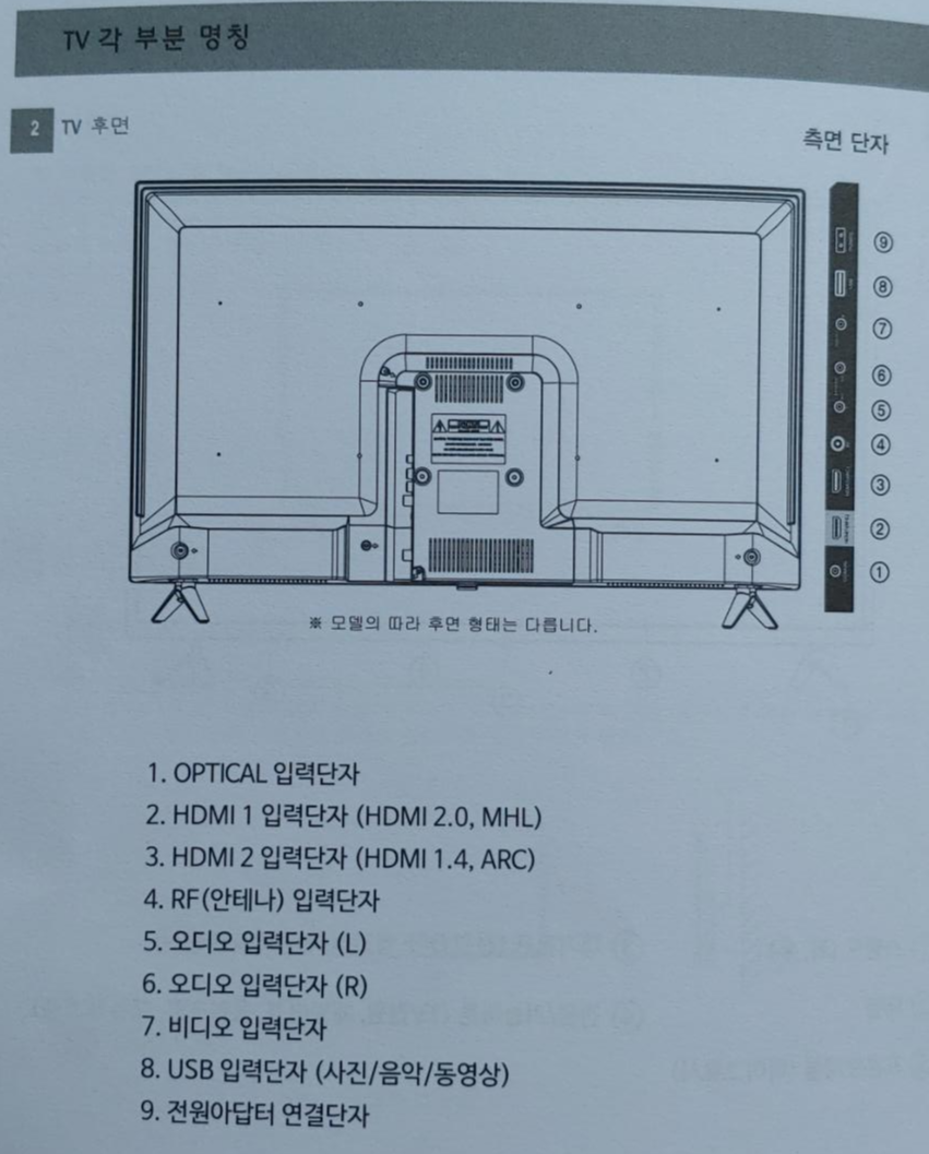단자구성 : HDMI x 2 (ARC, MHL(HDMI 2.0v)), 컴포지트, 광출력 x 1, RF안테나 x 1, USB x 1