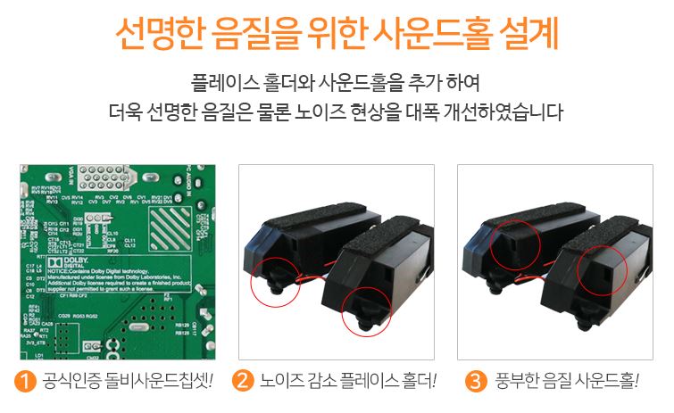 플레이스 홀더와 사운드홀을 추가 하여 더욱 선명한 음질은 물론 노이즈 현상을 대폭 개선하였습니다