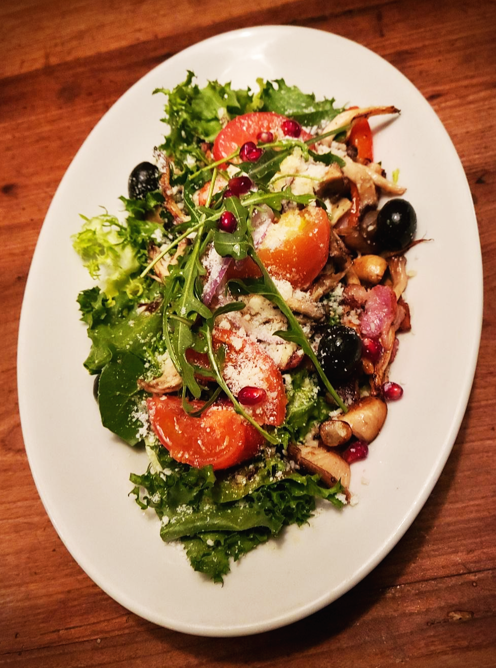 신선한 야채와 적당히 구워진 버섯 그리고 베이컨과