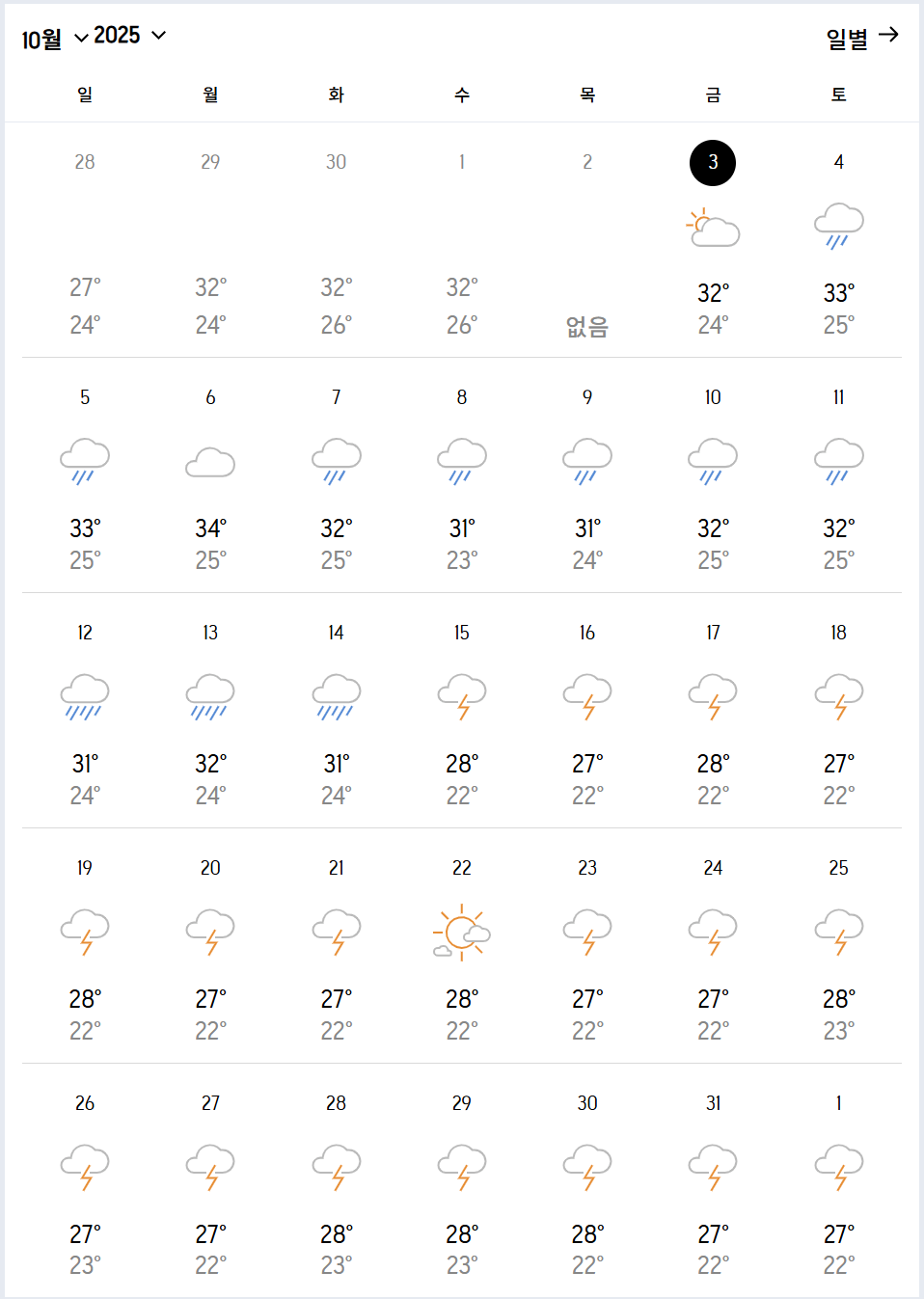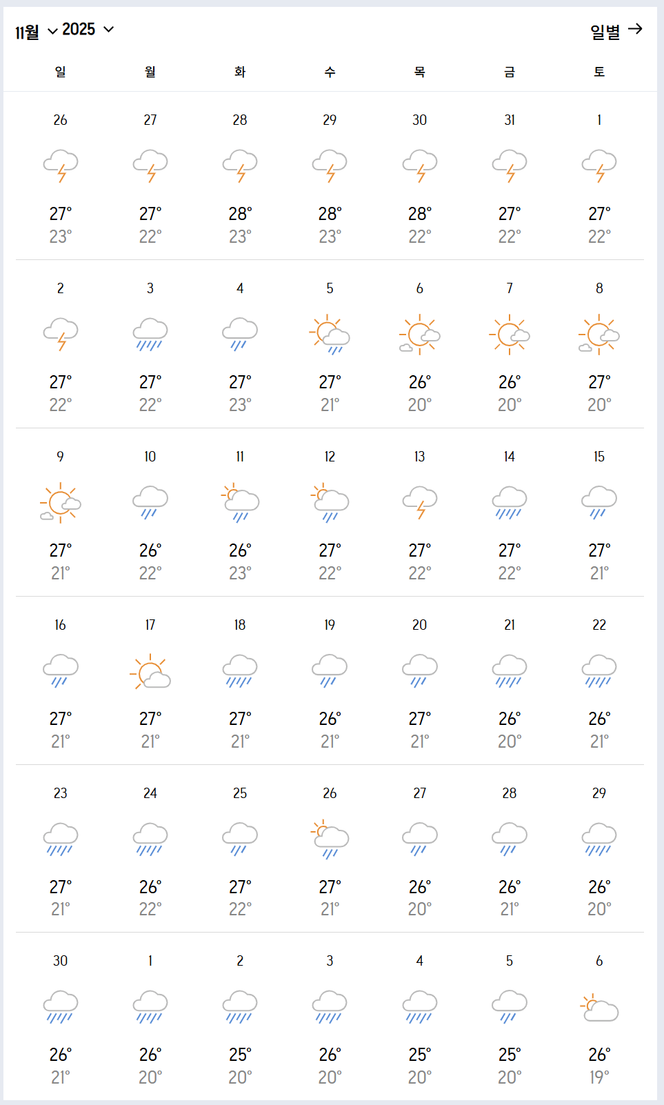낮 최고 29~30°C, 밤 최저 24~25°C로 무덥고 습합니다.