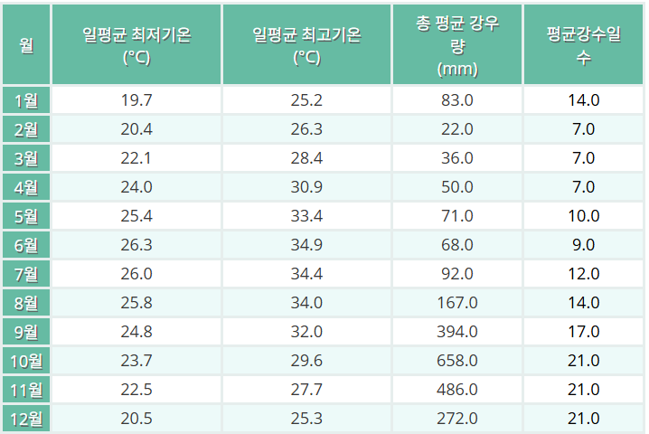| 7월 | 26.0 | 34.4 | 92.0 | 12.0 |