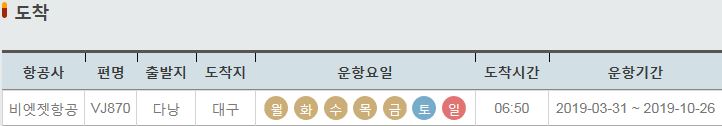 VJ870 / 다낭 / 대구 / 월 화 수 목 금 토 일 / 06:50 / 2019-03-31 ~ 2019-10-26