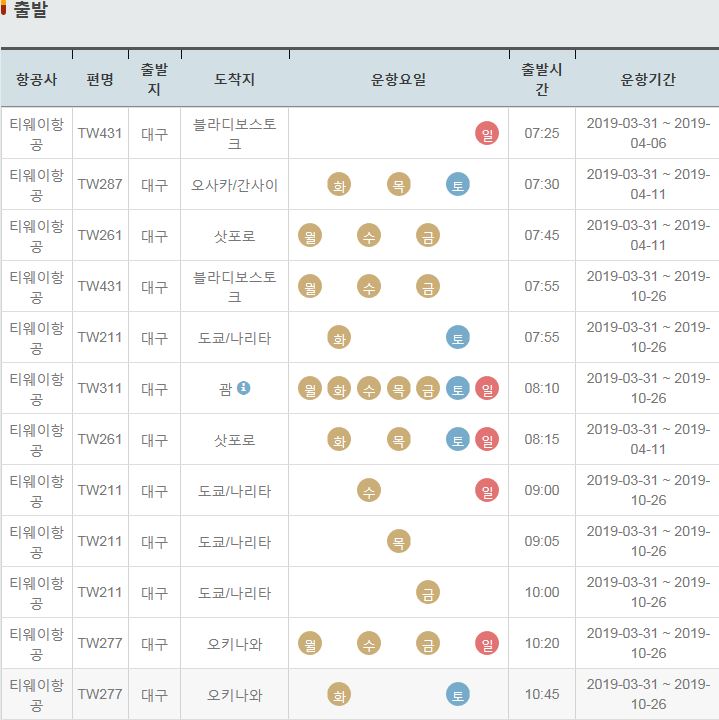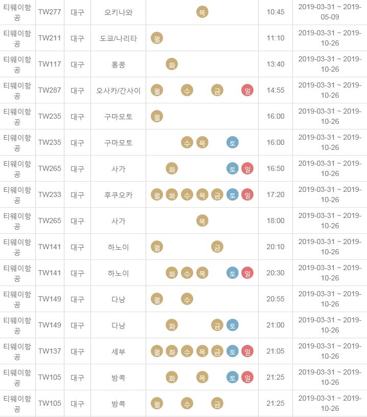 TW277 / 대구 / 오키나와 / 목 / 10:45 / 2019-03-31 ~ 2019-05-09