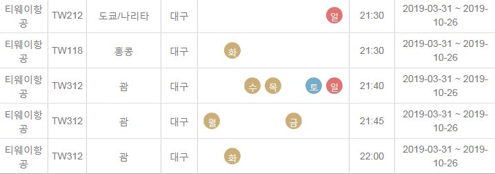 TW212 / 도쿄 나리타 / 대구 / 일 / 21:30 / 2019-03-31 ~ 2019-10-26