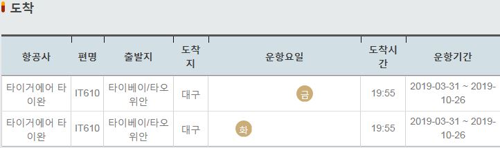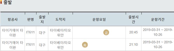 IT611 / 대구 / 타이베이 타오위안 / 금 / 20:45 / 2019-03-31 ~ 2019-10-26