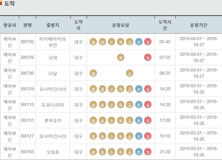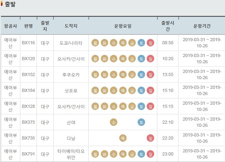 BX375 / 대구 / 산야 / 수 토 / 22:10 / 2019-03-31 ~ 2019-10-26