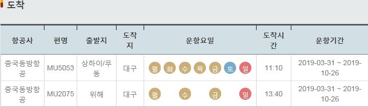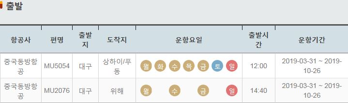 MU5053 / 상하이 푸동 / 대구 / 월 화 수 목 금 토 일 / 11:10 / 2019-03-31 ~ 2019-10-26