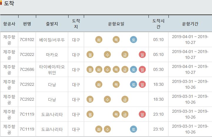 도착(편명 / 출발지 / 도착지 / 운항요일 / 출발시간 / 운항기간)