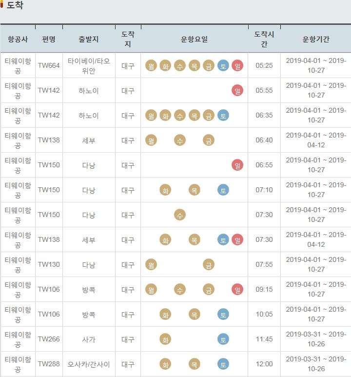 TW142 / 하노이 / 대구 / 일 / 05:55 / 2019-04-01 ~ 2019-10-27