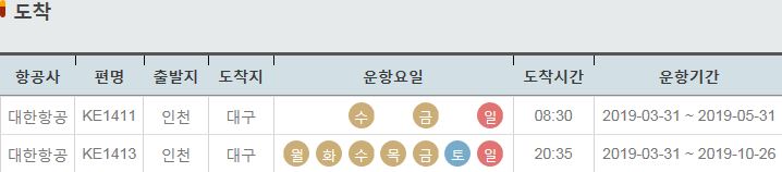 KE1411 / 인천 / 대구 / 수 금 일 / 08:30 / 2019-03-31 ~ 2019-05-31