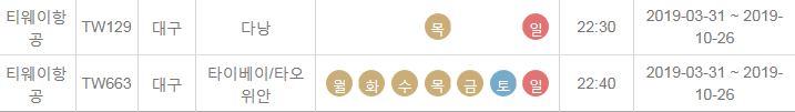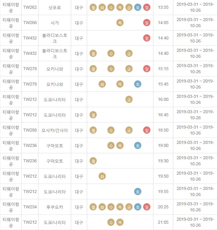 TW212 / 도쿄 나리타 / 대구 / 토 / 19:55 / 2019-03-31 ~ 2019-10-26