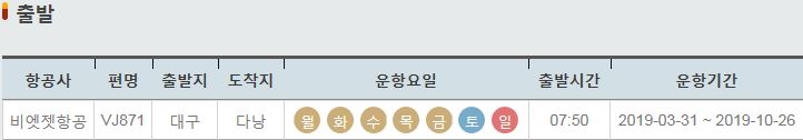 VJ871 / 대구 / 다낭 / 월 화 수 목 금 토 일 / 07:50 / 2019-03-31 ~ 2019-10-26
