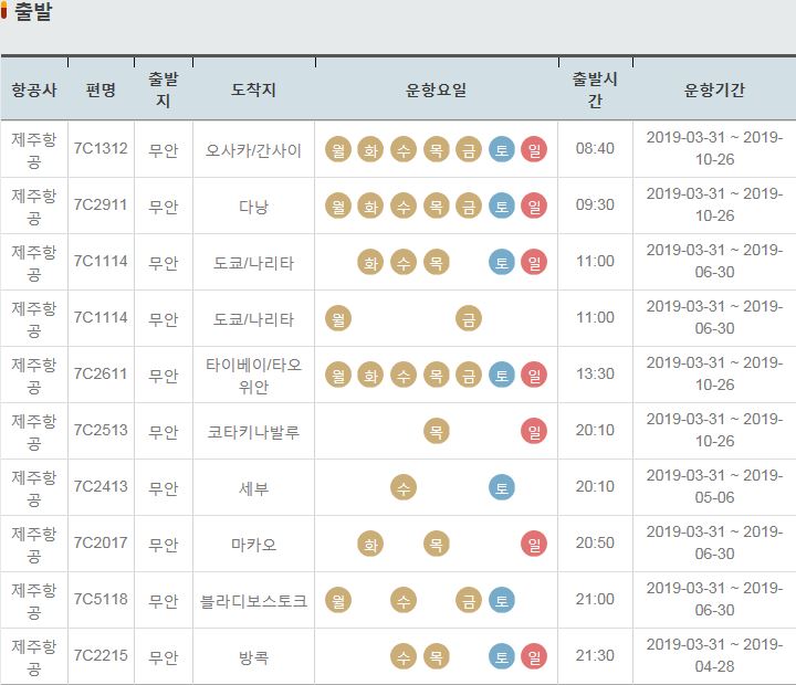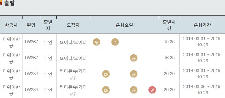 TW267 / 무안 / 오이다 오이타 / 금 / 16:35 / 2019-03-31 ~ 2019-10-26