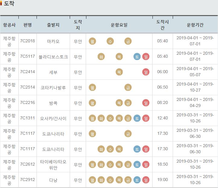 7C1114 / 무안 / 도쿄 나리타 / 월 금 / 11:00 / 2019-03-31 ~ 2019-06-30