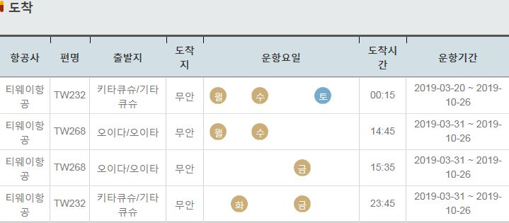 TW268 / 오이다 오이타 / 무안 / 금 / 15:35 / 2019-03-31 ~ 2019-10-26