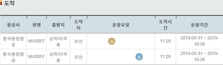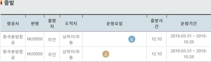 MU5058 / 무안 / 상하이 푸동 / 수 / 12:10 / 2019-03-31 ~ 2019-10-26