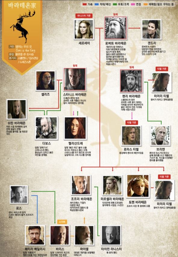 로버트의 사후 권력욕과 야망에 사로잡힌 대표인물들 타이윈과 세르세이 그 동생들인 제이미와 티리온도 작품 초반에는 비호감쪽 이었으나 시즌이 거듭되며 이성적이고 인간적인 모습을 반복적으로 보여 줬습니다