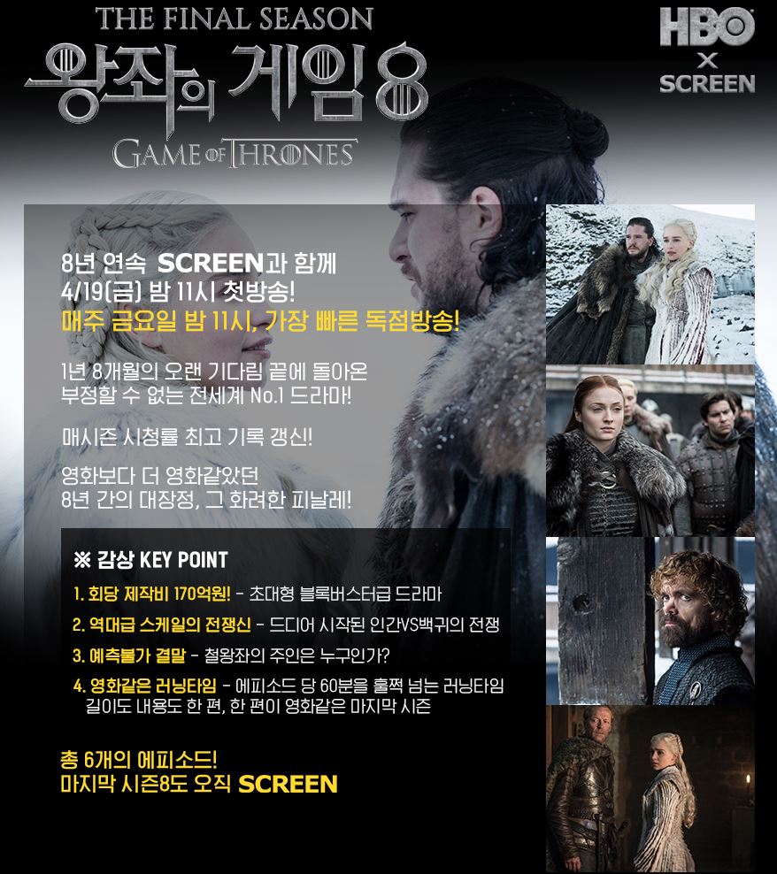 왕좌의 게임 시즌 8(GAME OF THRONES SEASON 8)은 6편 밖에 안되기 때문에 각 화의 방영시간이 늘어났습니다