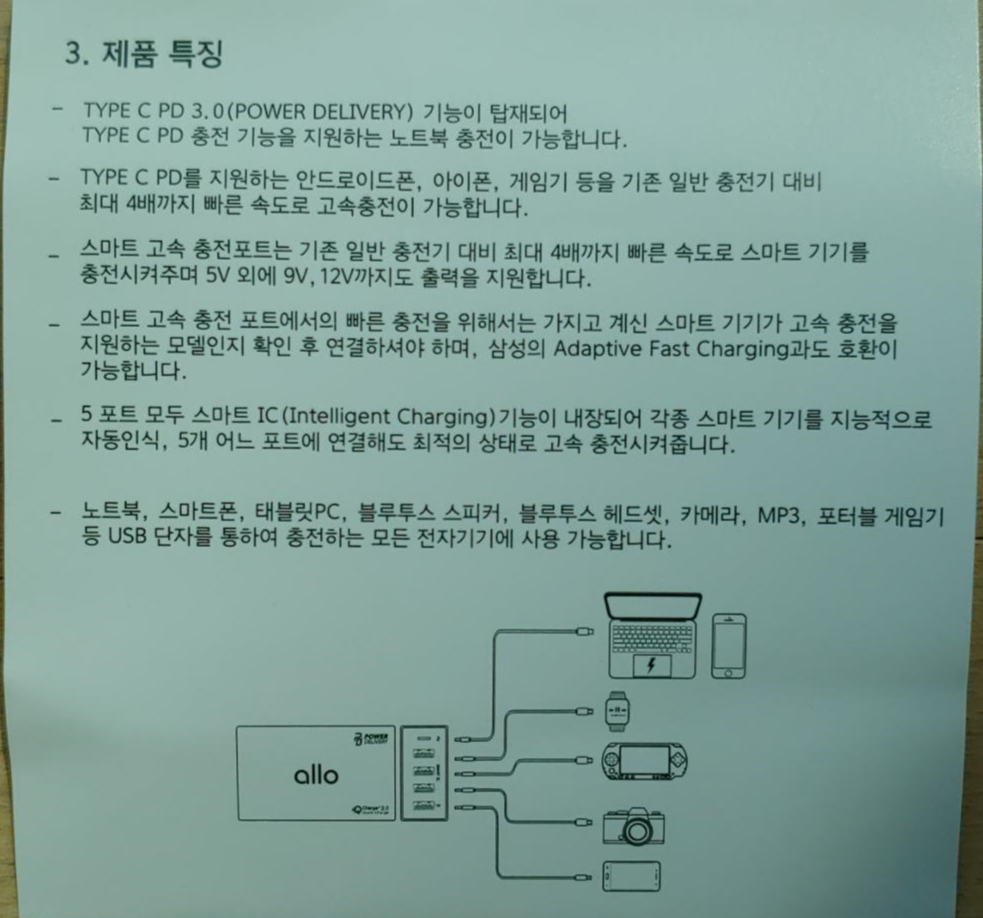 일반 충전기만 사요을 하다가 알로코리아 고속멀티충전기 UC560PD를 손으로 들었을때 무게감이 조금 느껴 졌으며 전체적인 만듬새는 좋습니다